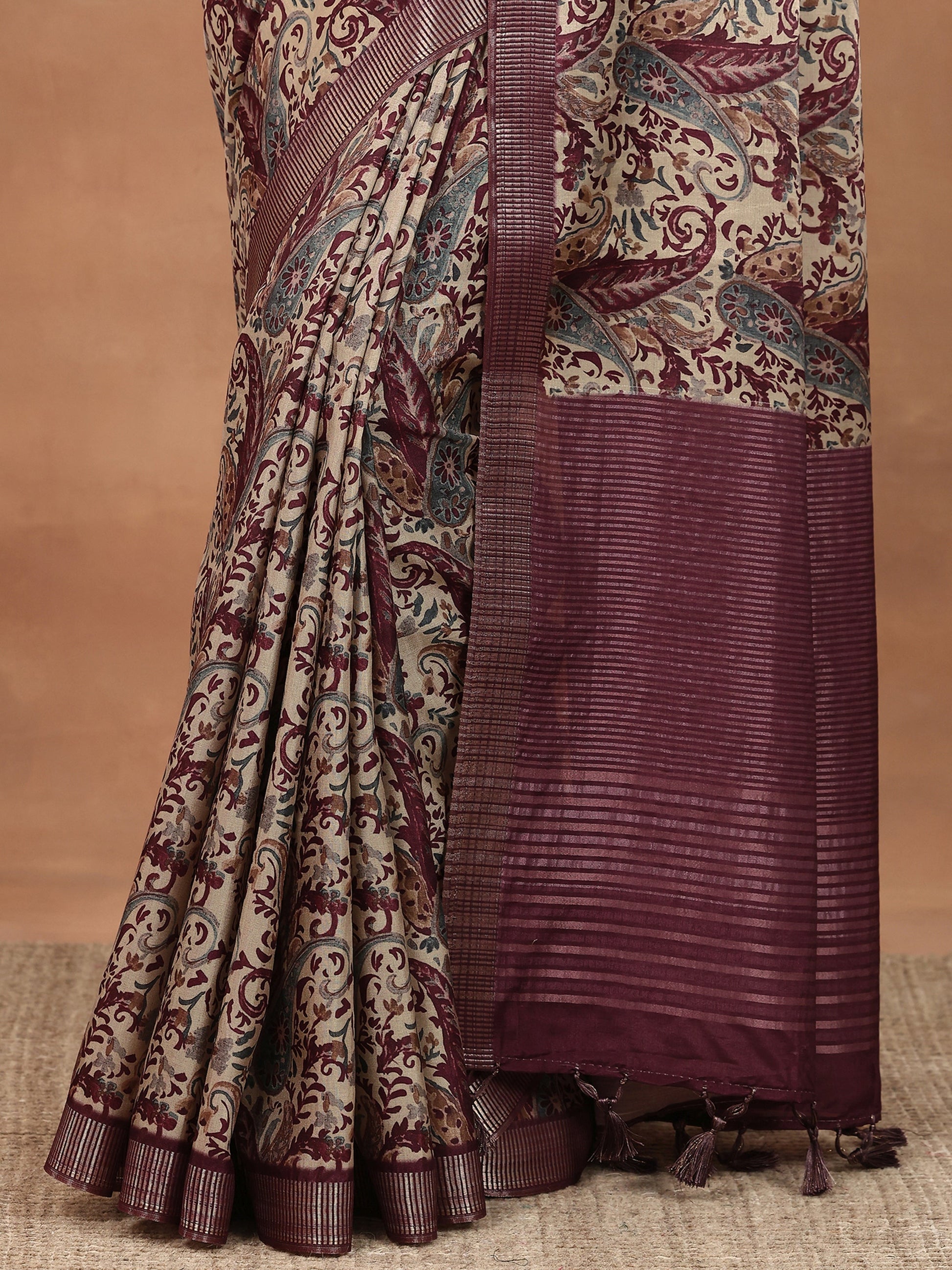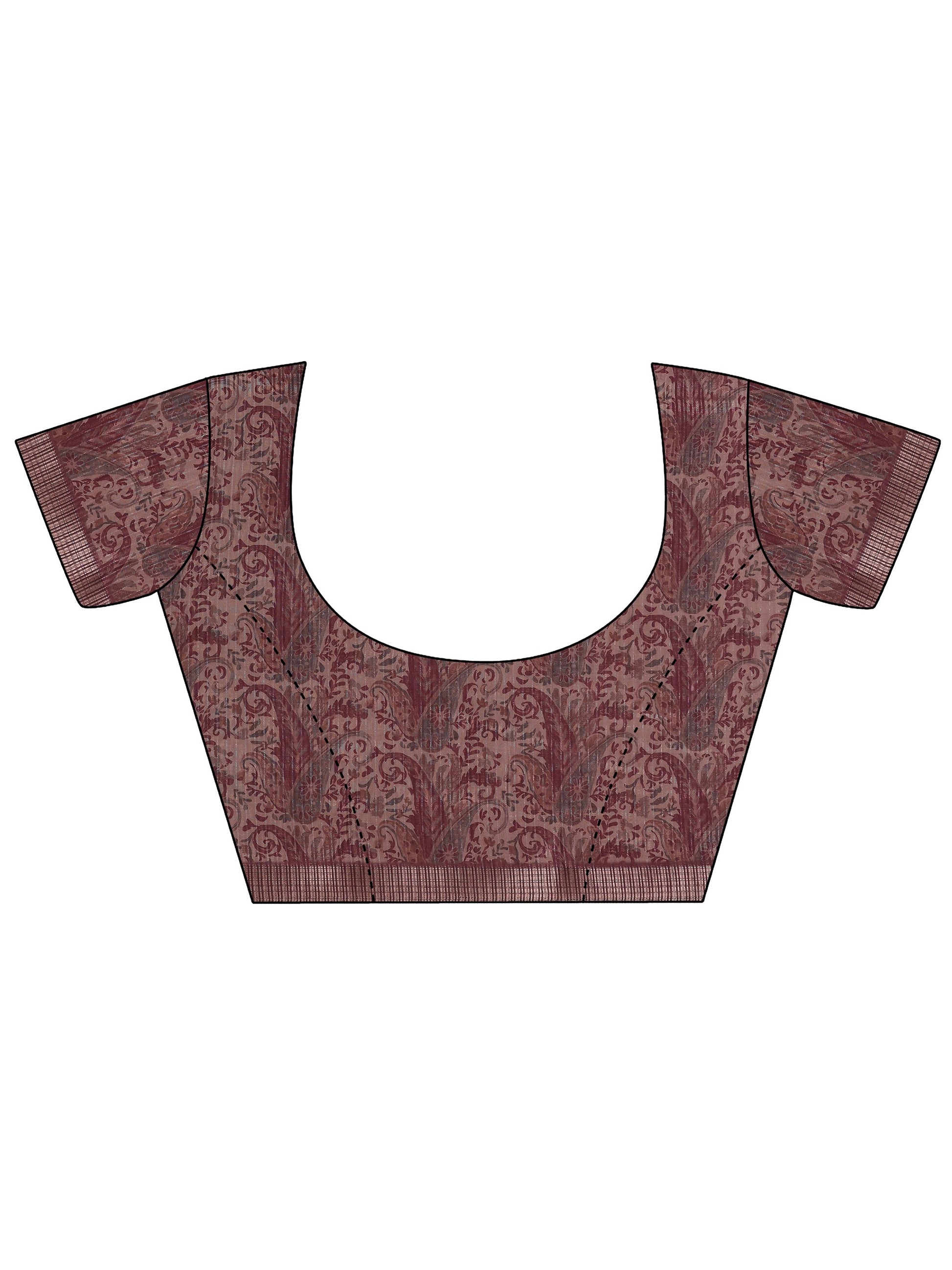 Burgundy Printed Silk Blend Sarees With Unstitched Blouse Piece