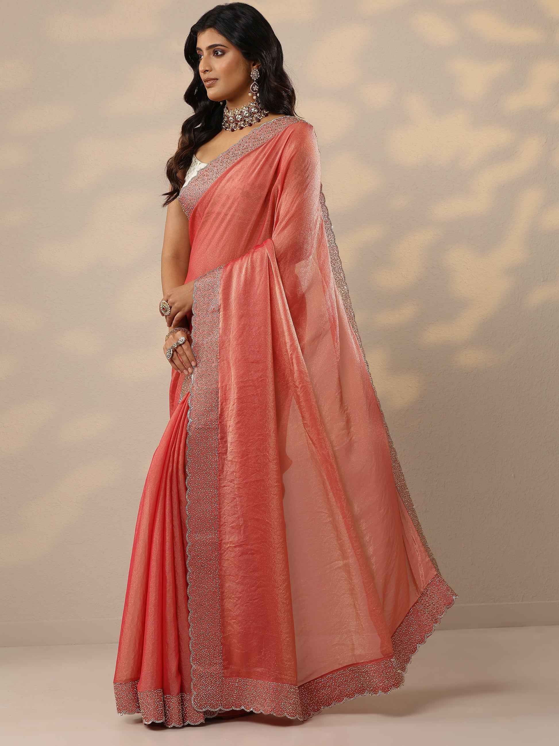 Coral Embellished Organza Sarees With Unstitched Blouse Piece