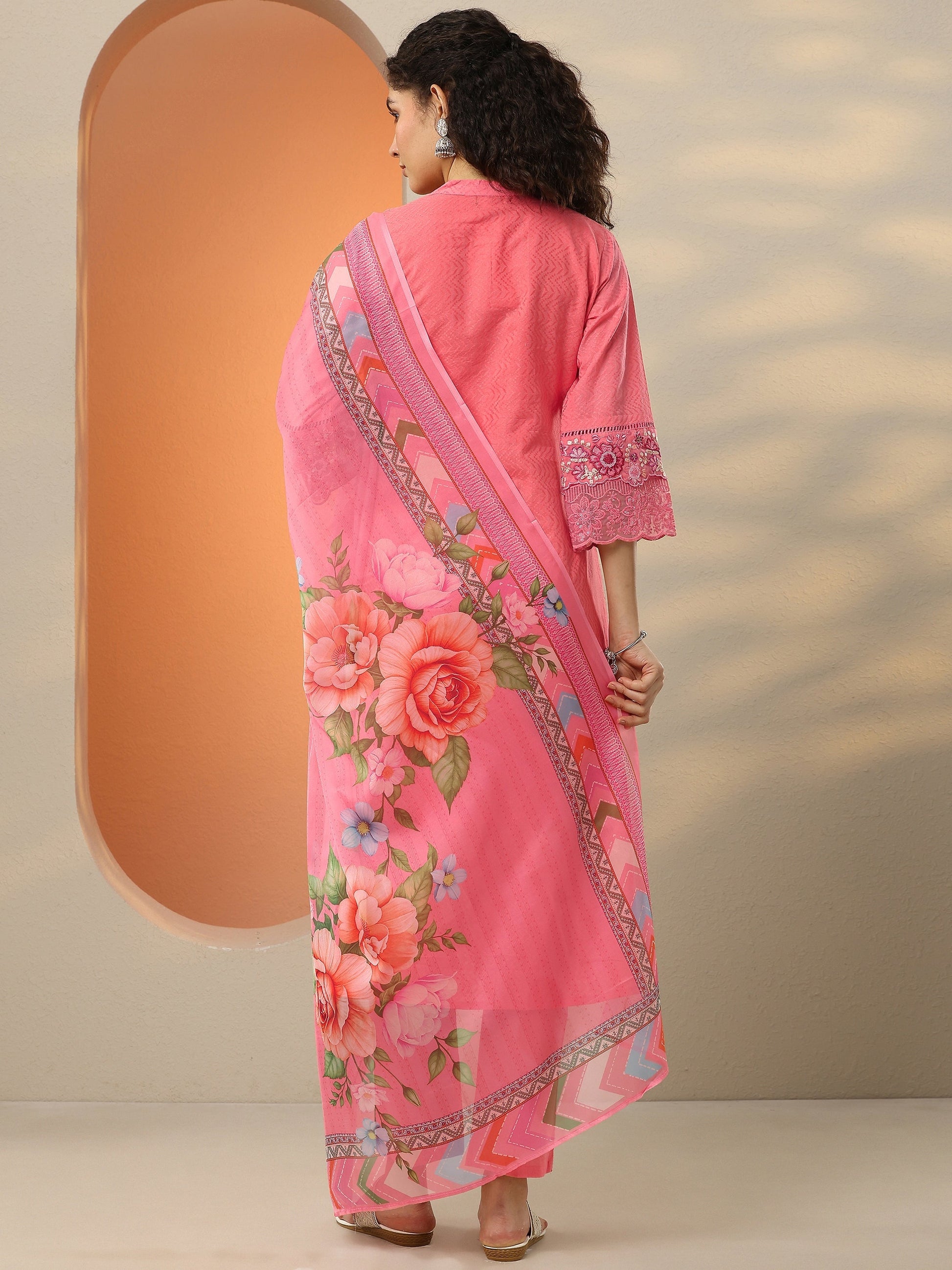 Coral Embroidered Cotton Blend A-Line Suit Set With Dupatta