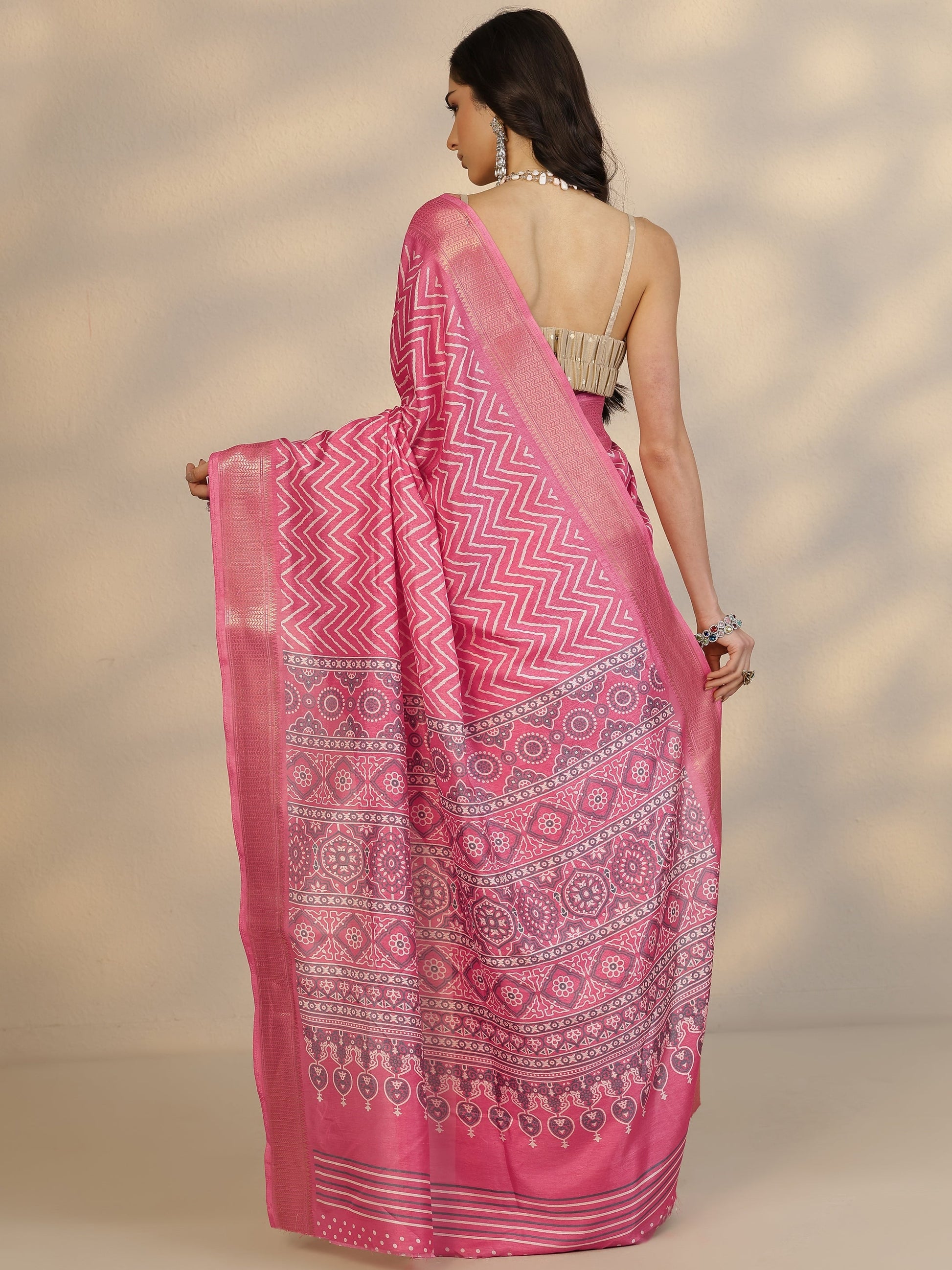 Coral Printed Silk Blend Saree With Unstitched Blouse Piece