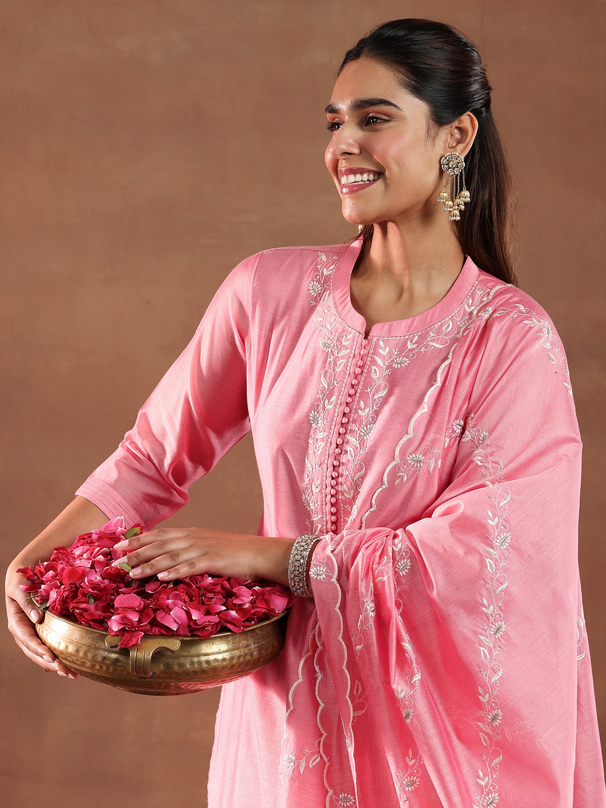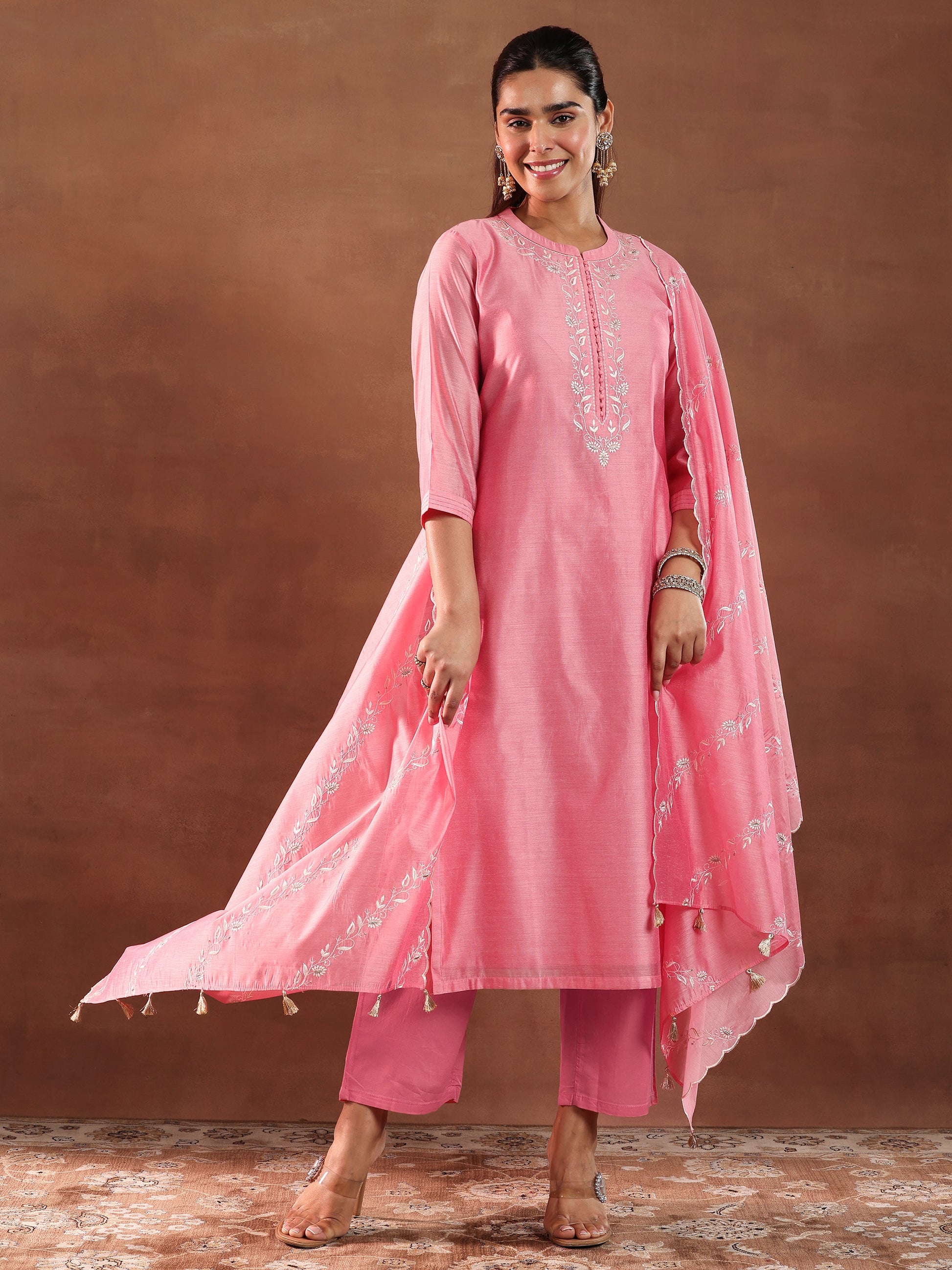 Our 3-piece coral yoke design Chanderi silk straight suit set features a kurta with a mandarin collar and three-quarter sleeves. Complemented with trousers with a partially elasticated waistband and roomy pockets, and a dupatta. Highlighted with floral embroidery, fabric button accents, and delicate tassels, this style is perfect for light festivities.