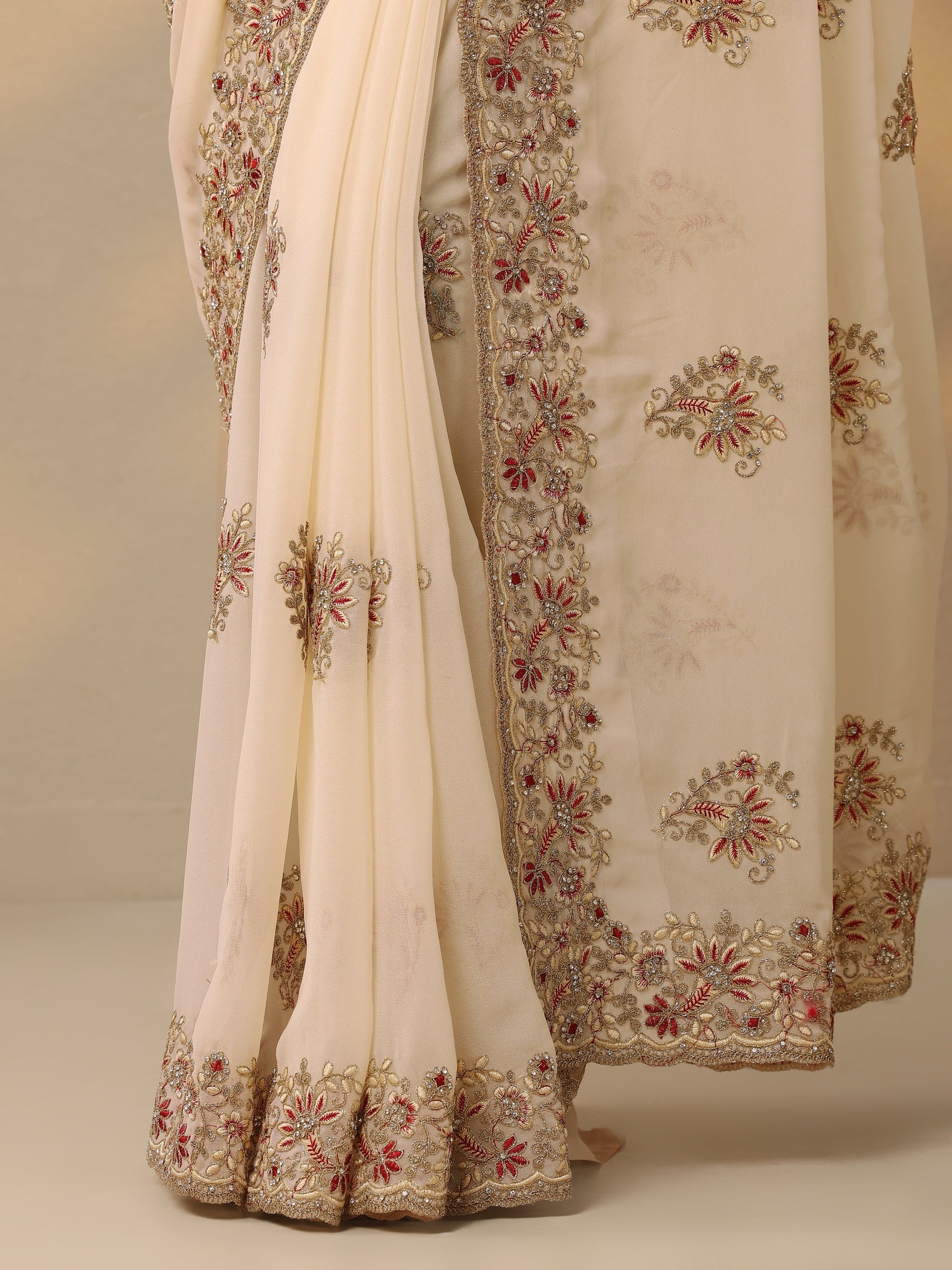 Cream Embellished Georgette Saree With Unstitched Blouse Piece