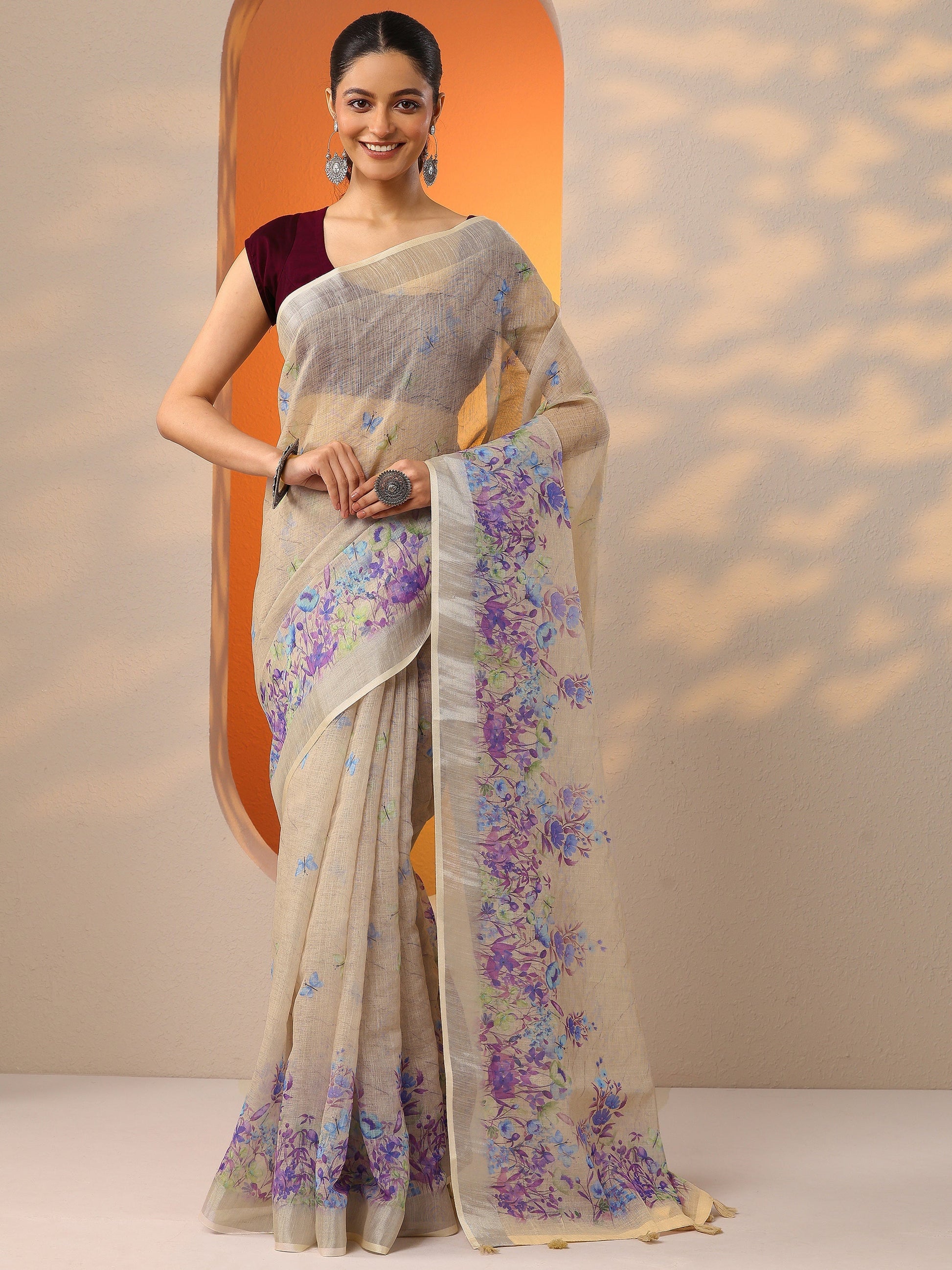Our Off White Printed Cotton Blend Saree Features Captivating Floral Print. Complemented With An Unstitched Blouse Piece. This Charming Saree Is Perfect For Casual Wear.