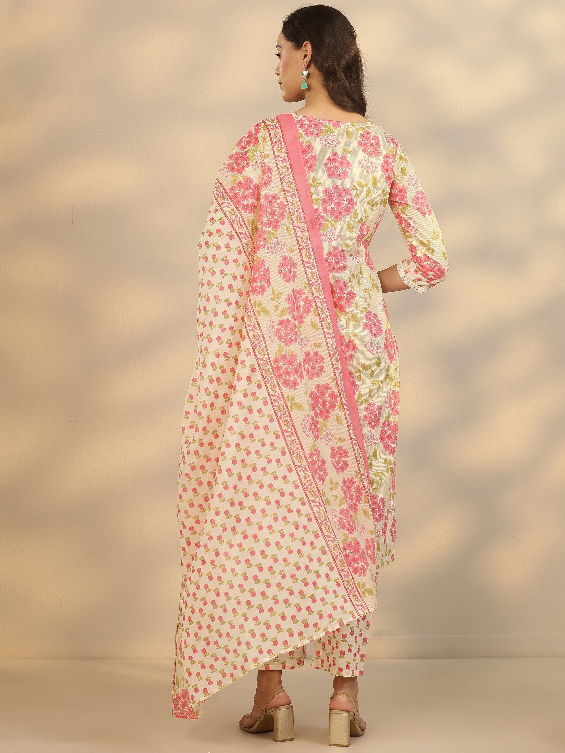 Our 3-piece Pink and Cream Cotton Straight-Fit Kurta Set features a Sweetheart Neckline, Regular Sleeves, and statement Yoke. Complemented with Straight Pants with a Partially Elasticated waistband and 2 pockets, and a Floral Dupatta. Adorned with Floral Printed , this style is perfect for Festive occasions.