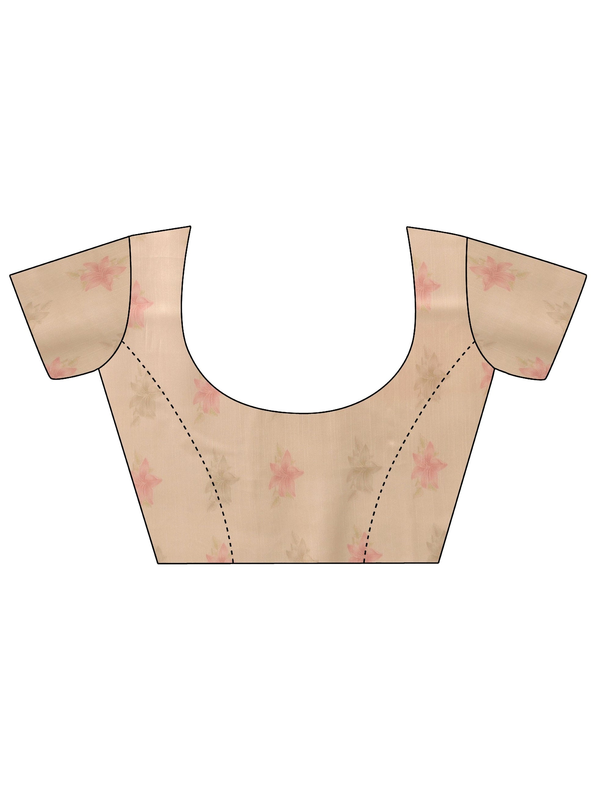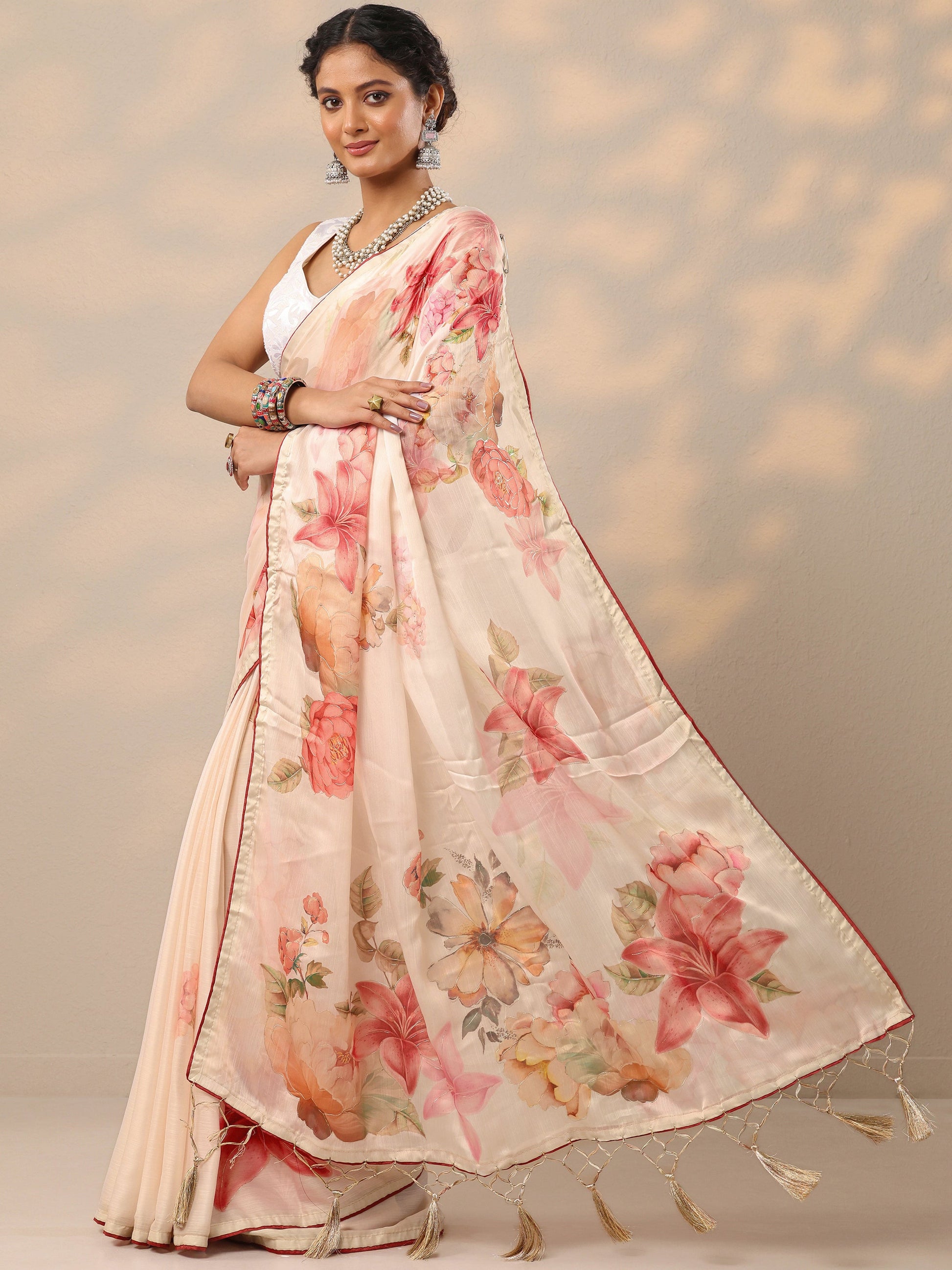 Our cream printed crepe saree features captivating floral print. Complemented with a blouse piece. This charming saree is perfect for festive occasions.