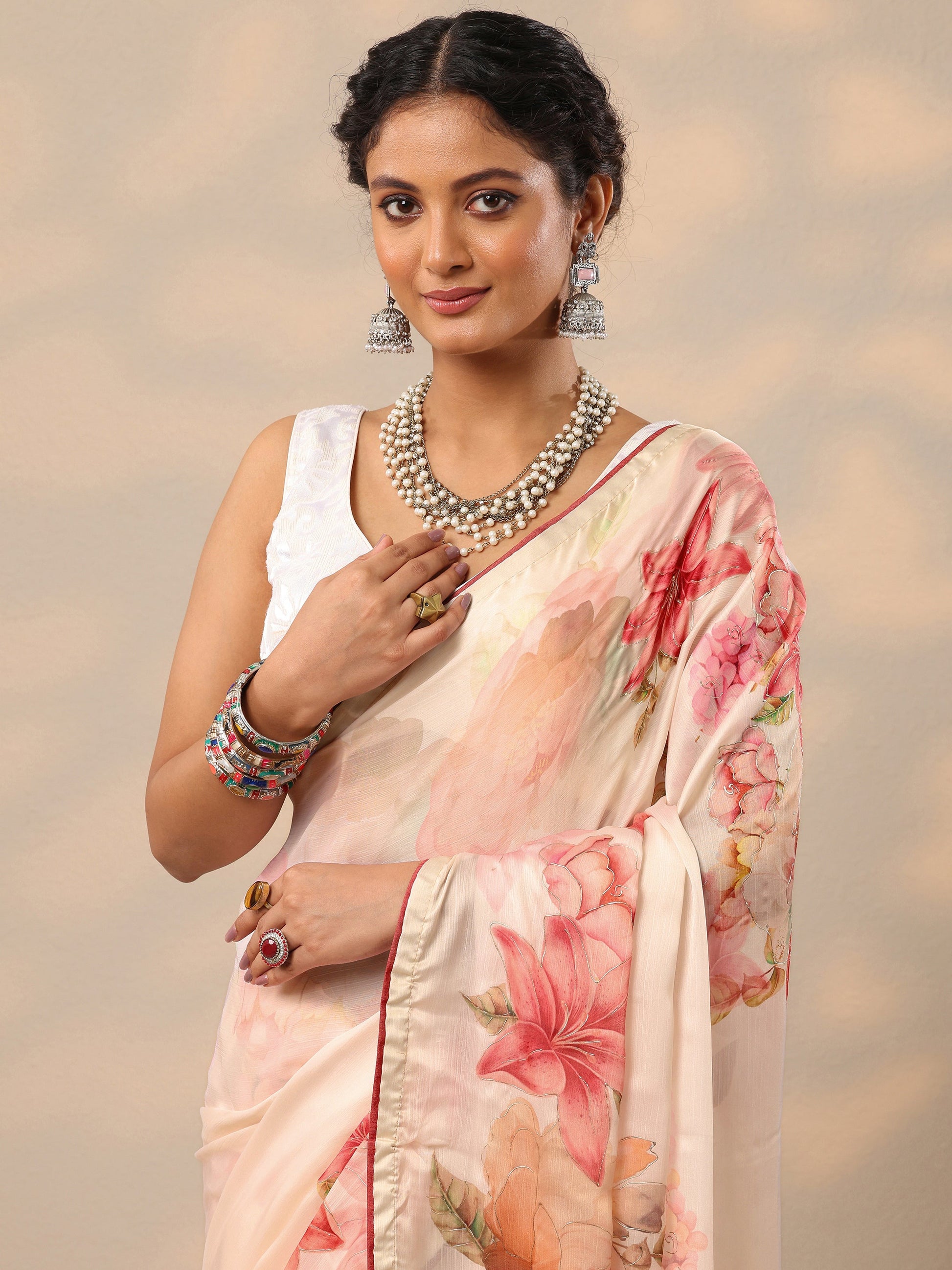 Cream Printed Crepe Saree With Unstitched Blouse Piece