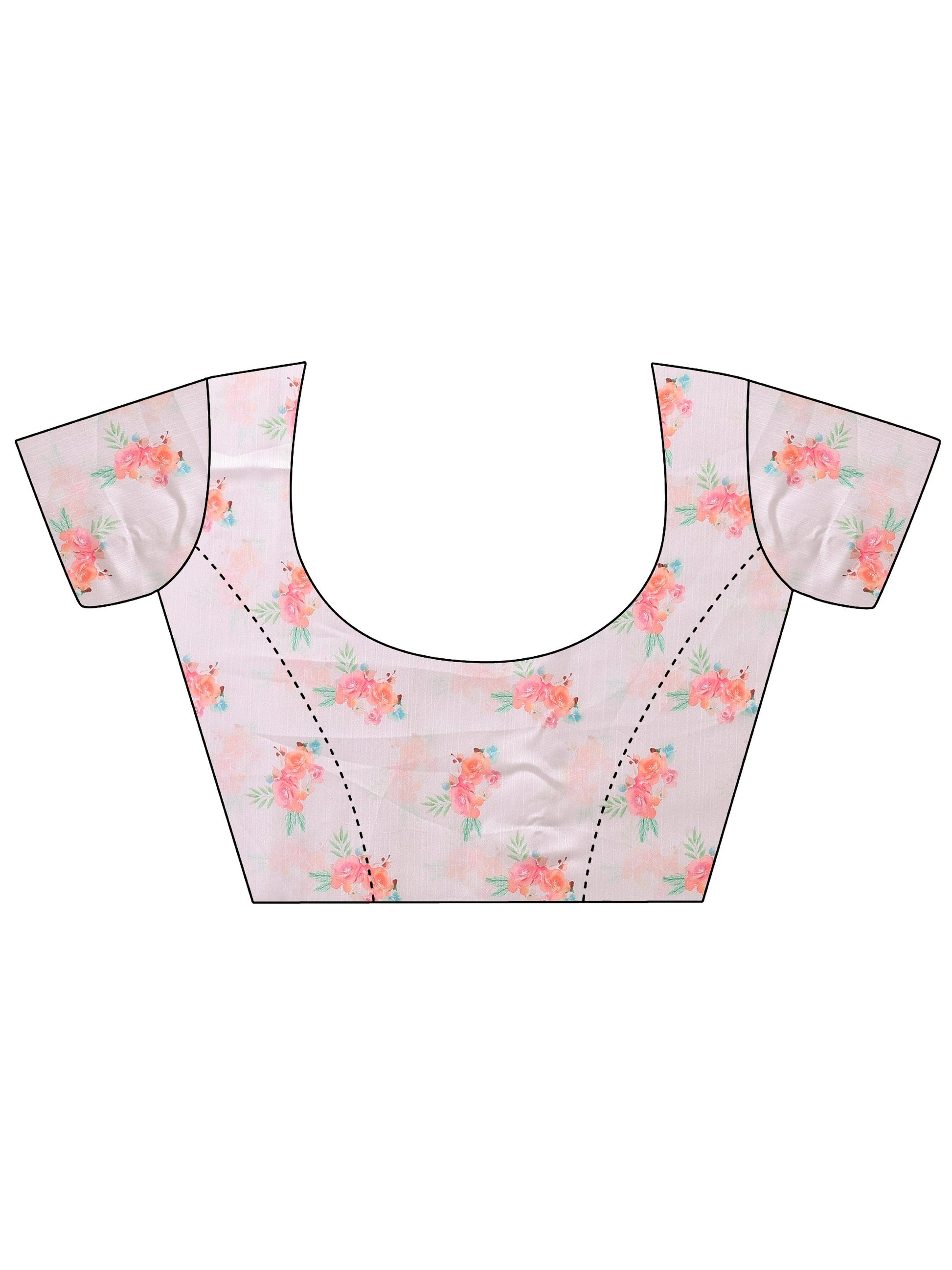Our White printed Crepe saree features captivating floral print. Complemented with a Blouse Piece. This charming saree is perfect for festive occasions.