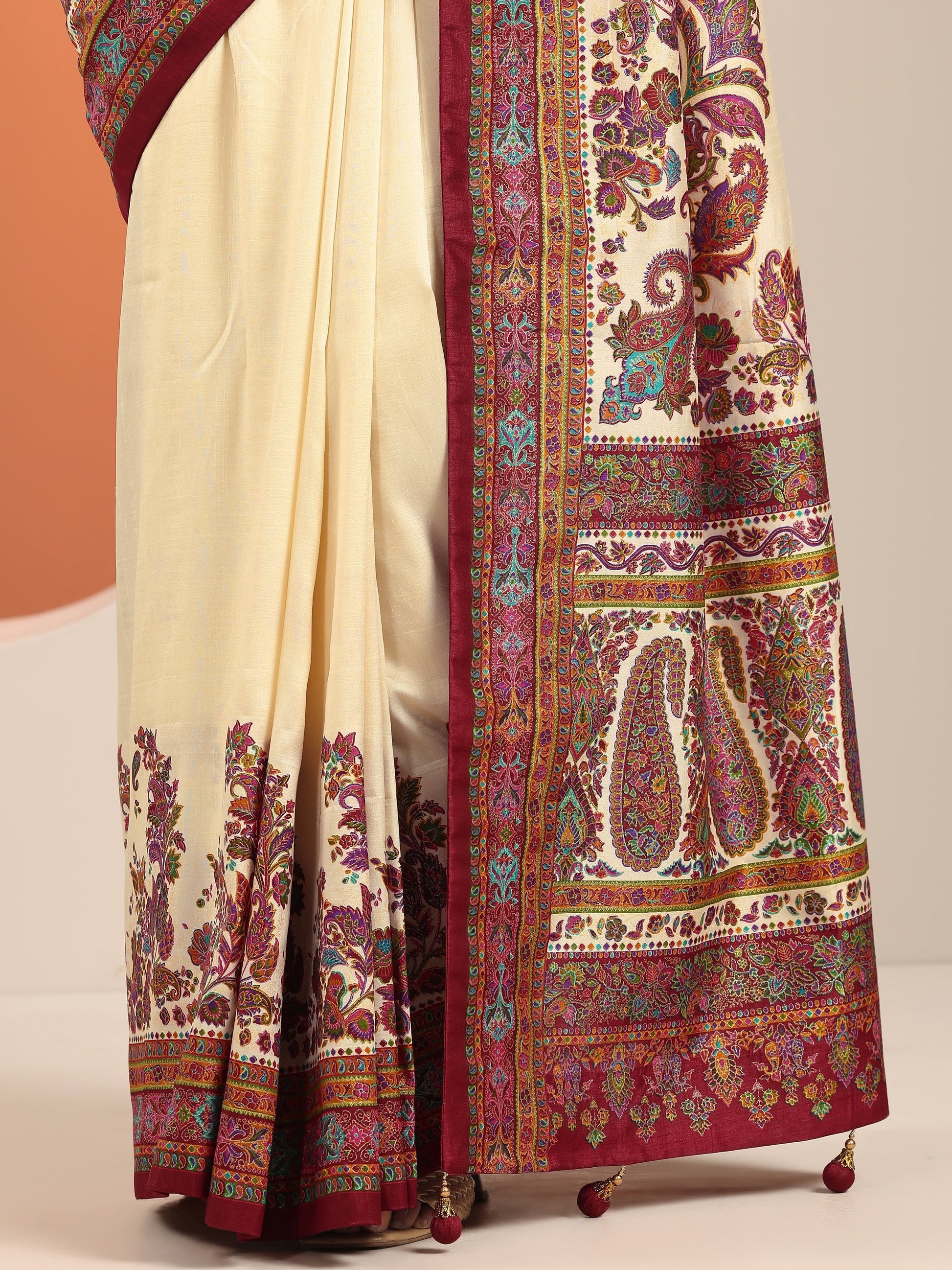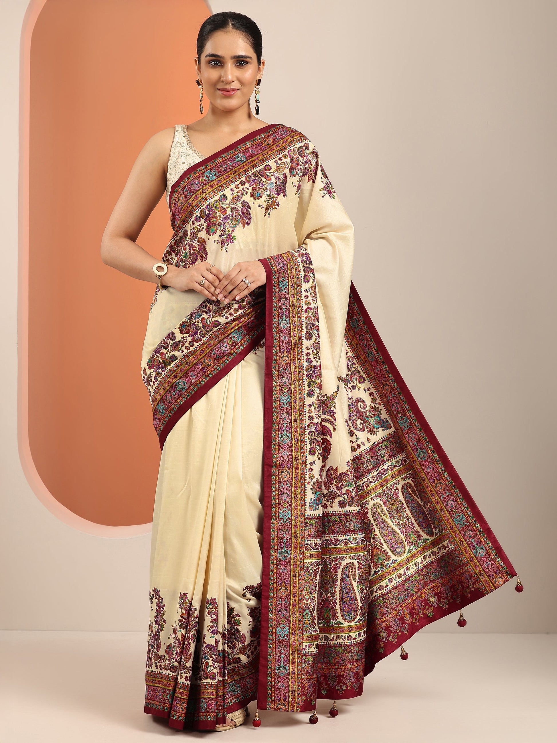 Cream Printed Silk Blend Saree With Unstitched Blouse Piece