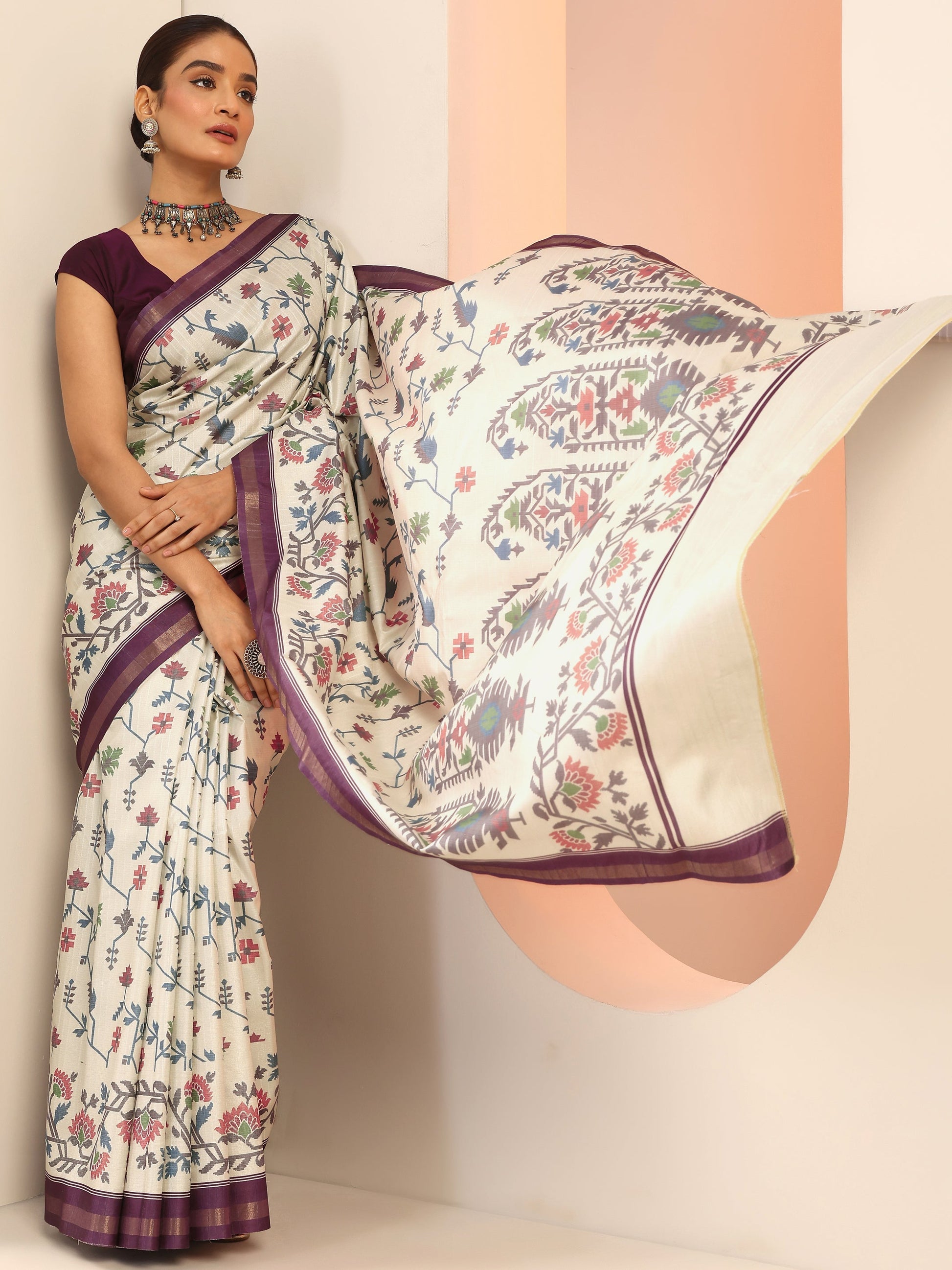 Cream Printed Silk Saree With Unstitched Blouse Piece