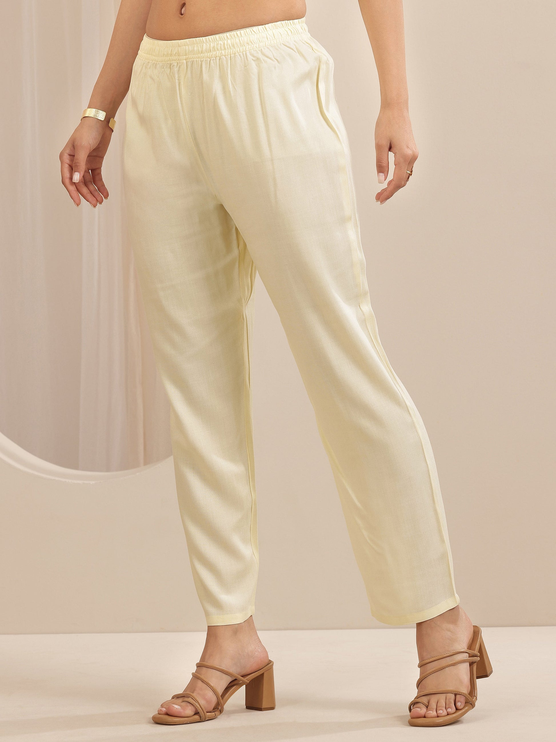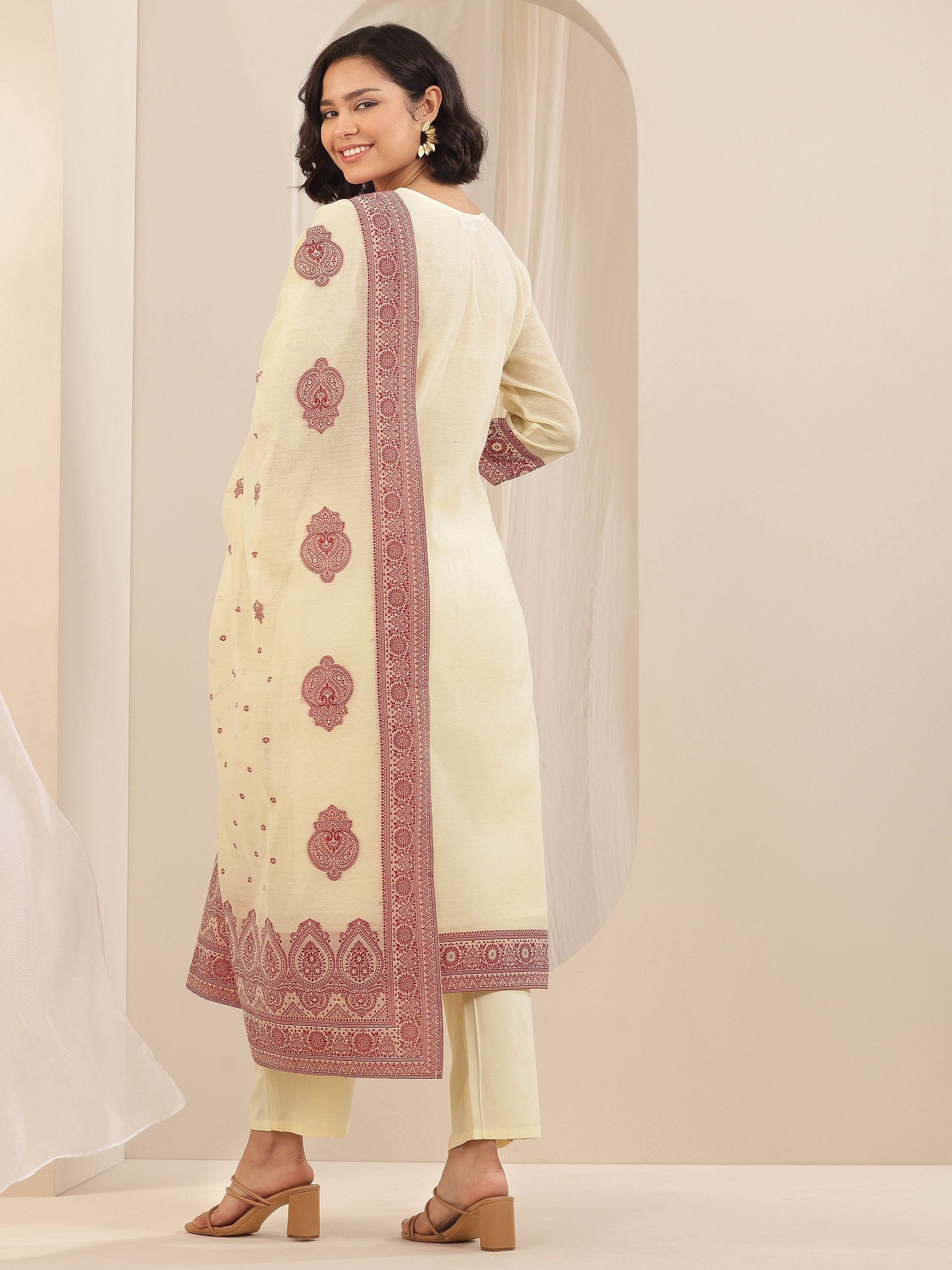 Our 3-piece cream Chanderi suit set features a straight-fit kurta set with a round neckline, regular sleeves, and a statement yoke. Complemented with straight pants with an elasticated waistband and a dupatta. Adorned with embroidered and printed self-design, this style is perfect for festive occasions.