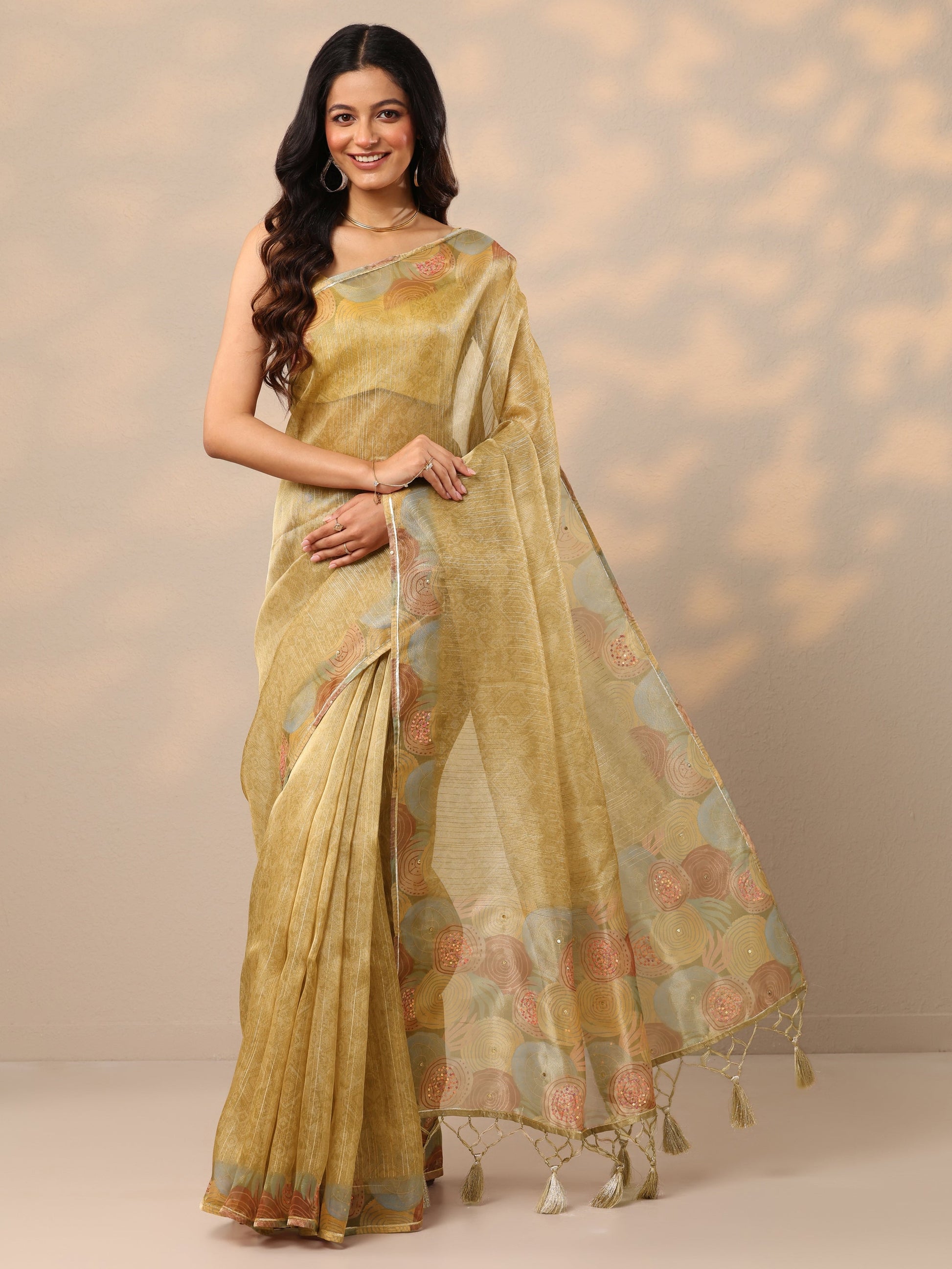 Gold Embellished Nylon Sarees With Unstitched Blouse Piece