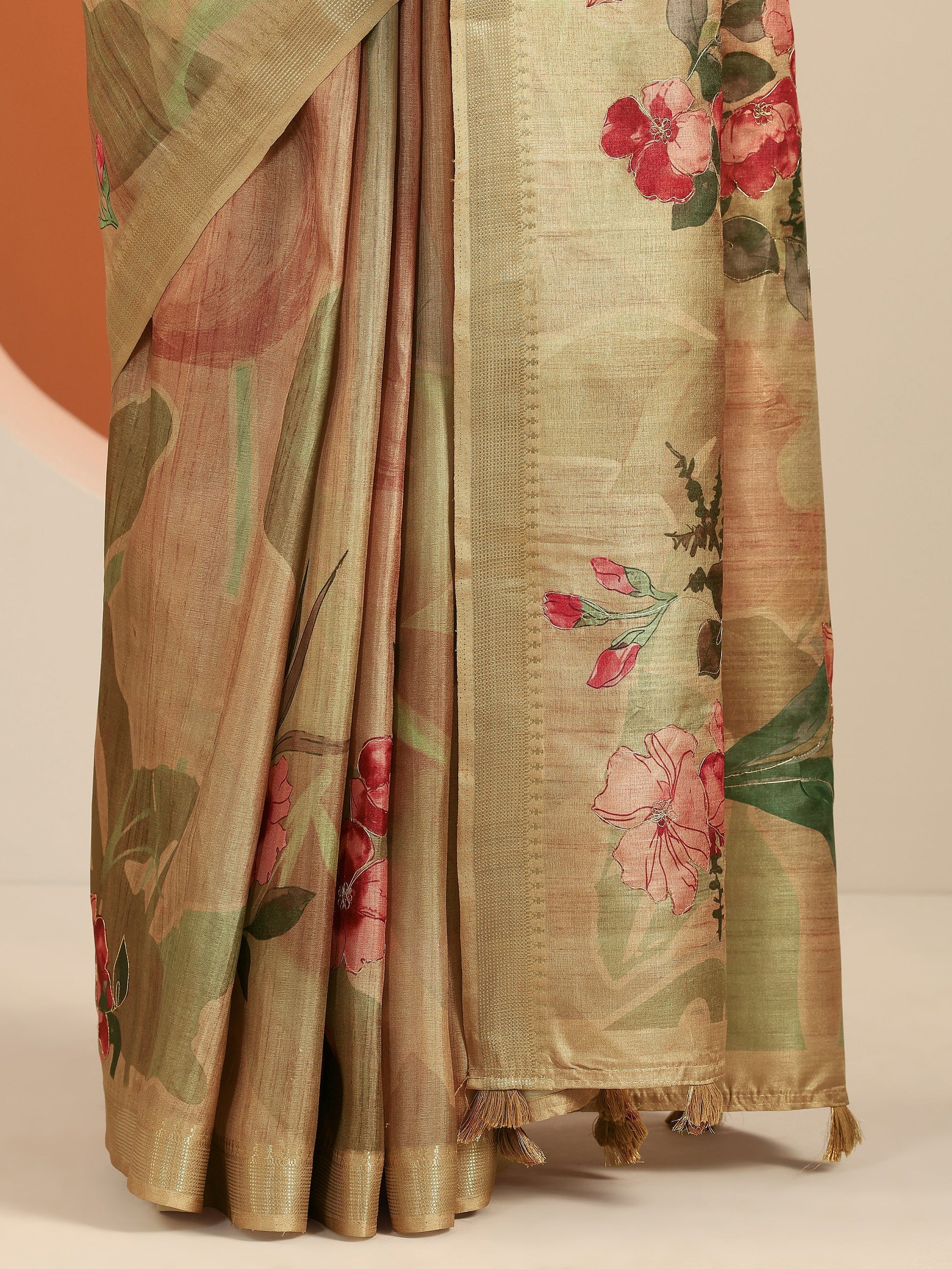 Our Beige Printed Silk Blend Saree Features Captivating Floral Printed Design. Complemented With A Unstitched Blouse Piece. This Charming Saree Is Perfect For Festive Wear.