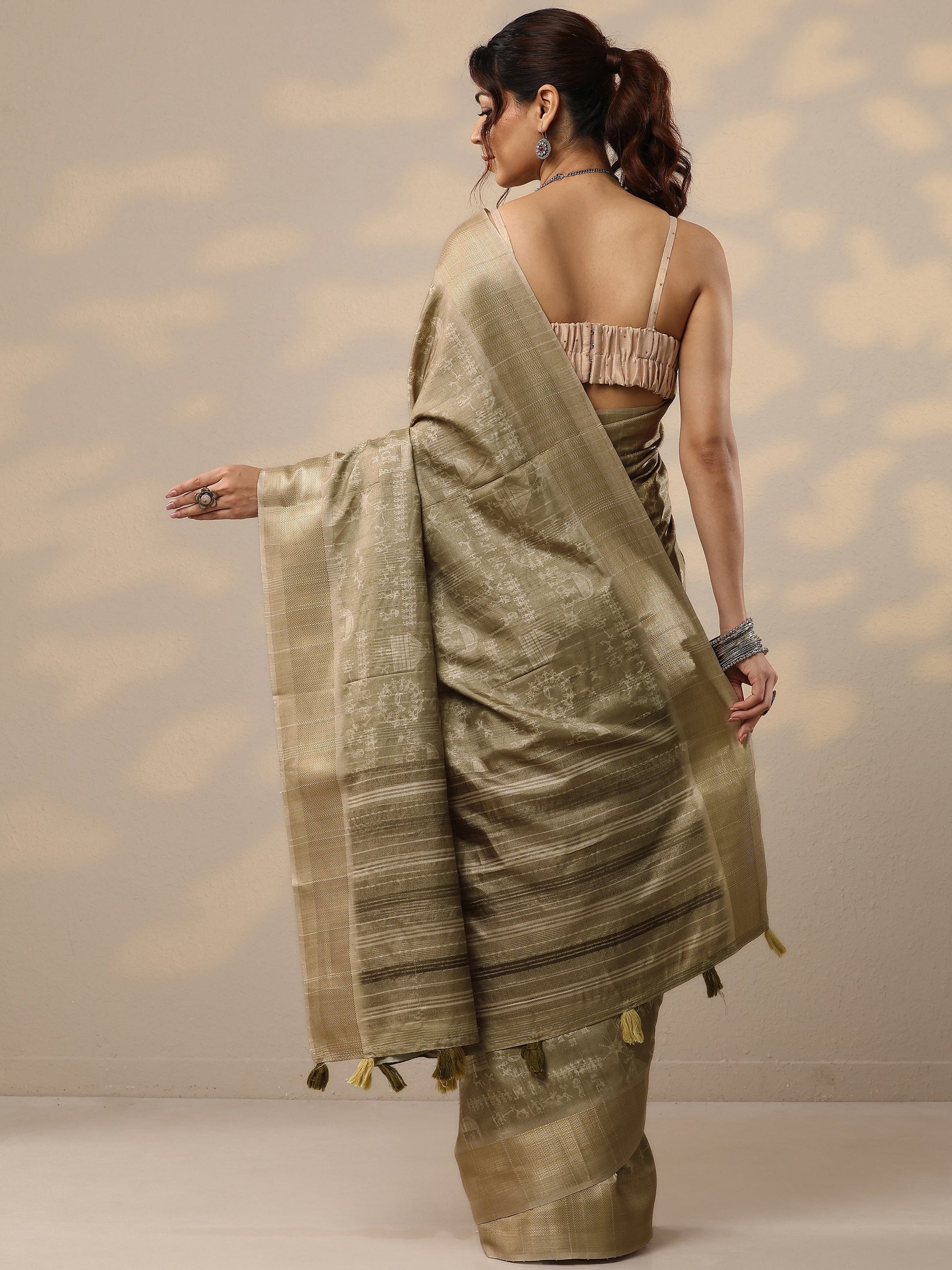 Gold Printed Silk Blend Sarees With Unstitched Blouse Piece