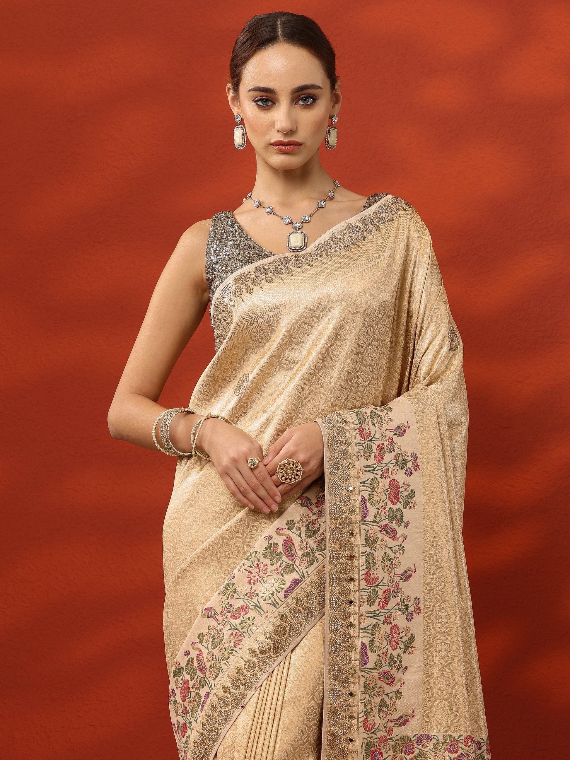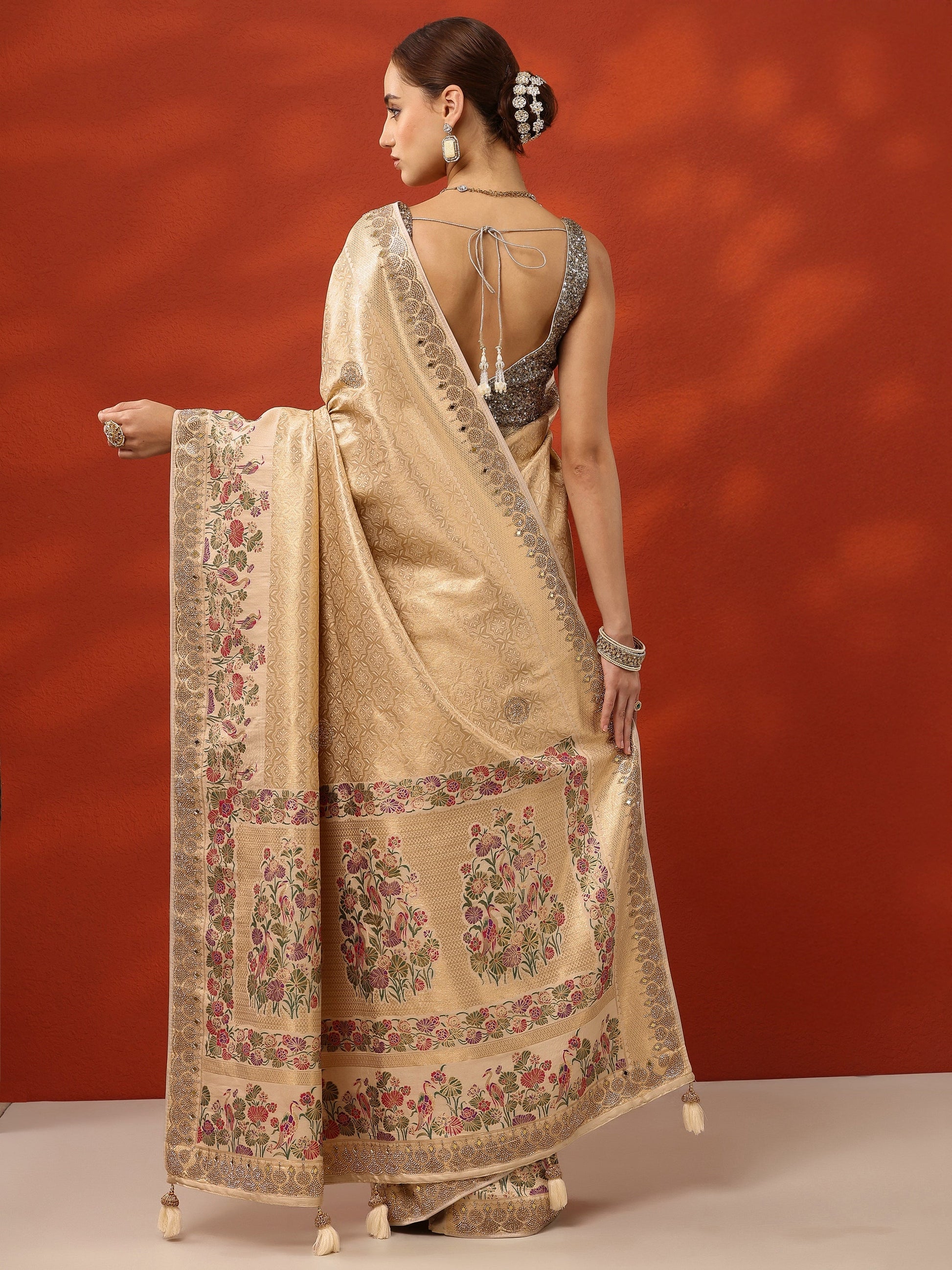 Our beige printed silk blend saree features captivating floral print. Complemented with a stitched blouse. This charming saree is perfect for festive occasions.