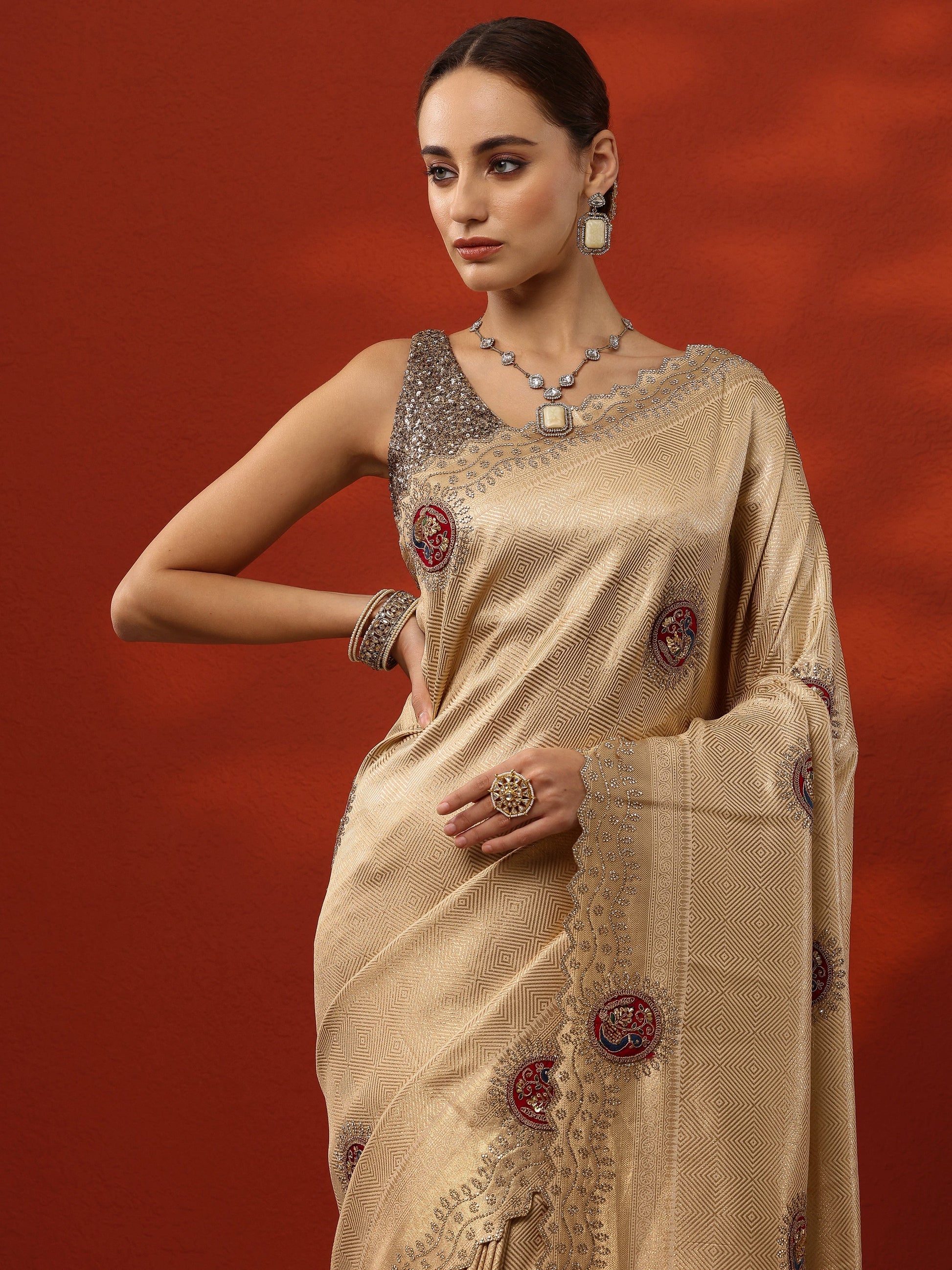 Our gold printed silk blend saree features captivating embellishments. Complemented with a stitched blouse. This charming saree is perfect for festive occasions.