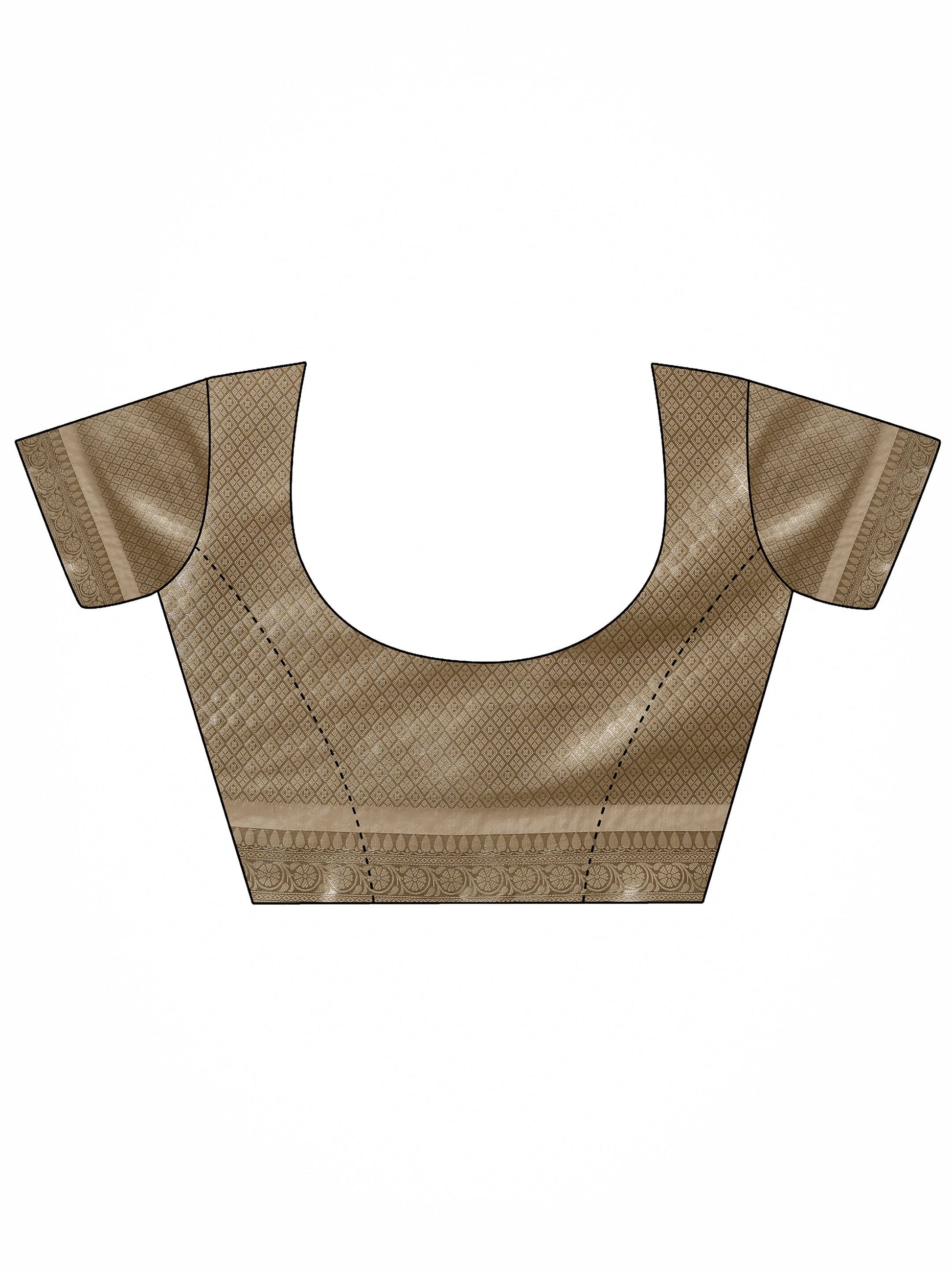 Our gold printed silk blend saree features captivating intricate patterns. Complemented with a blouse piece. This charming saree is perfect for festive occasions.