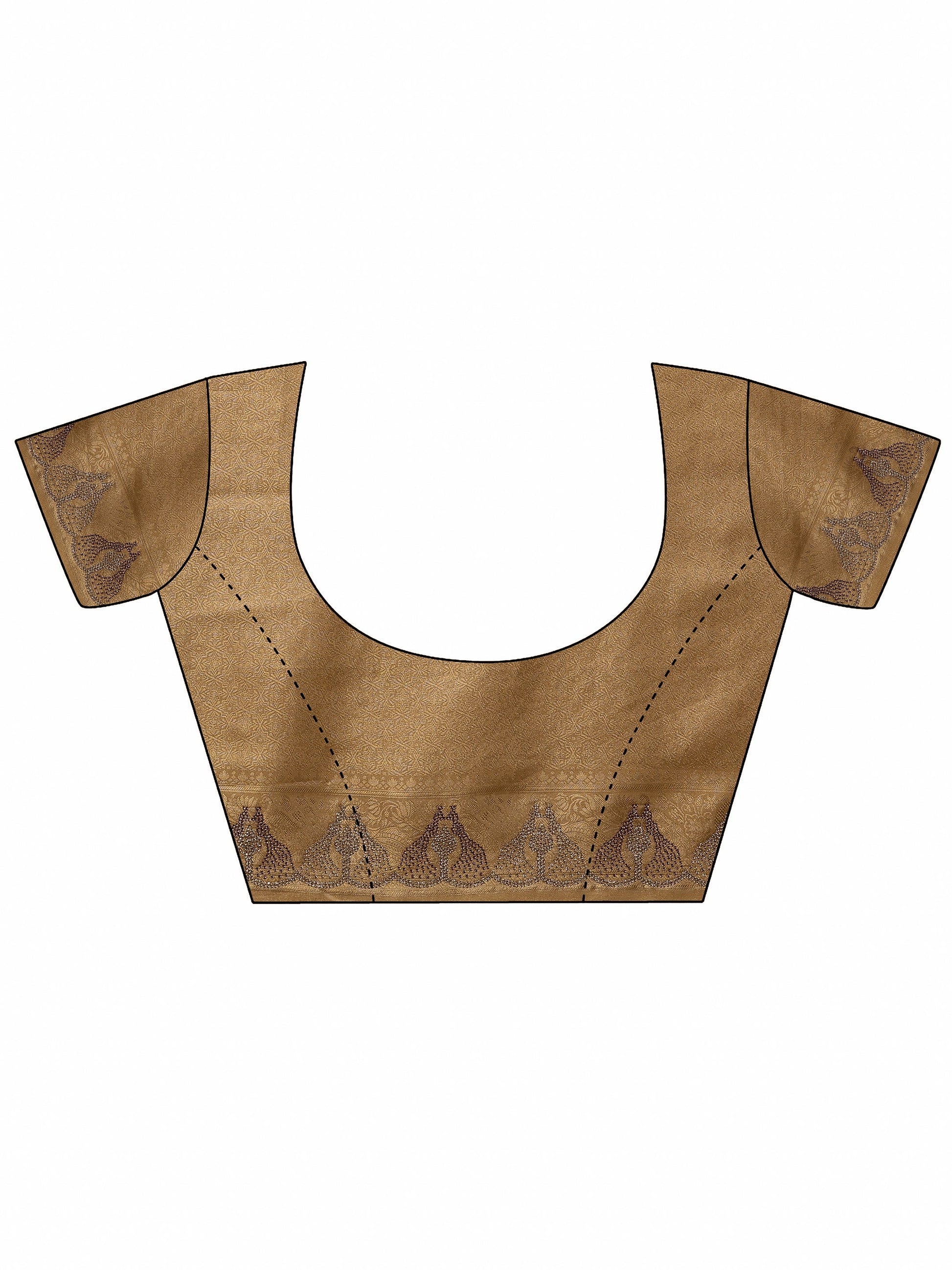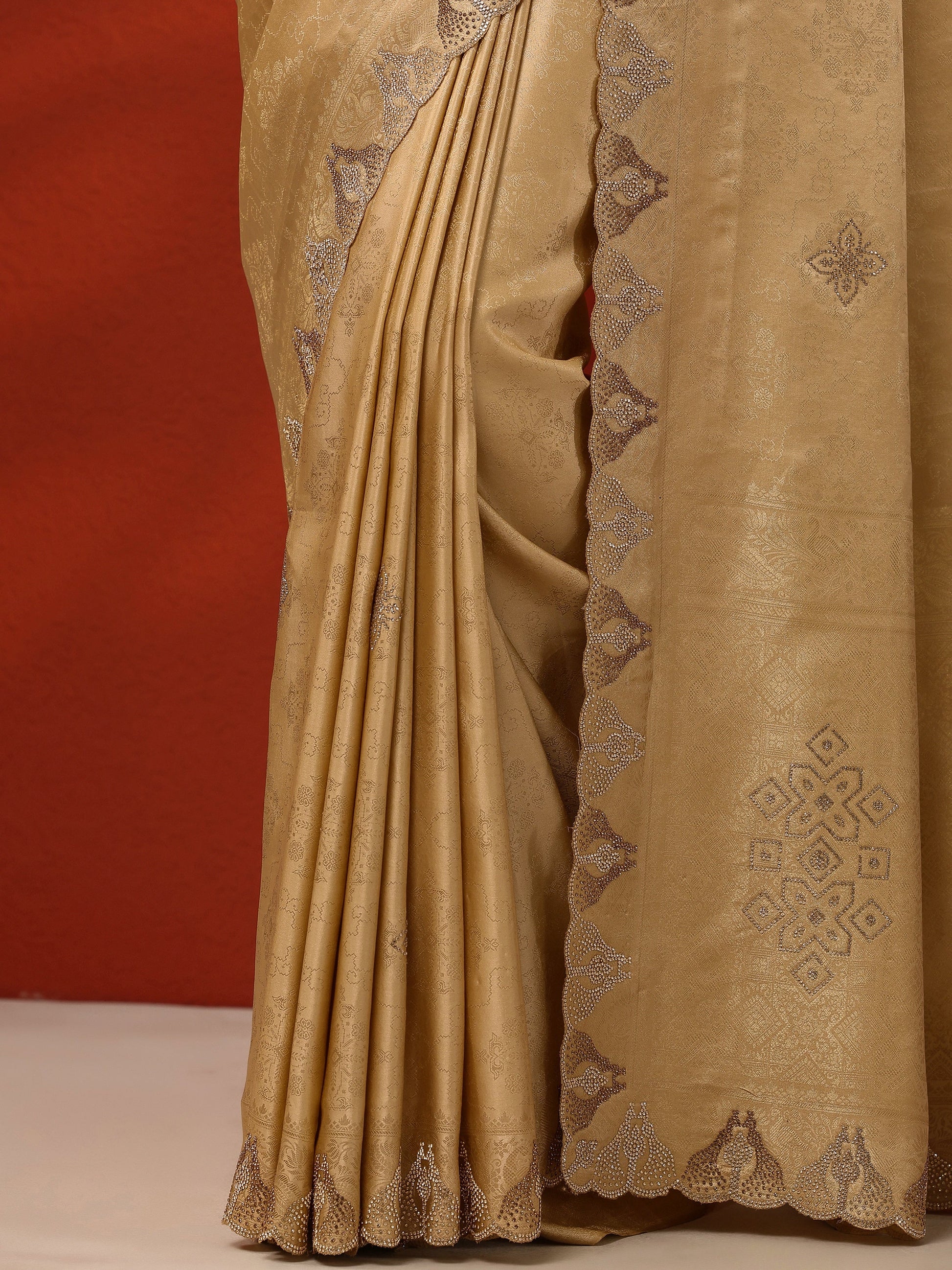 Our beige silk blend saree features captivating embellishments. Complemented with a stitched blouse. This charming saree is perfect for festive occasions.