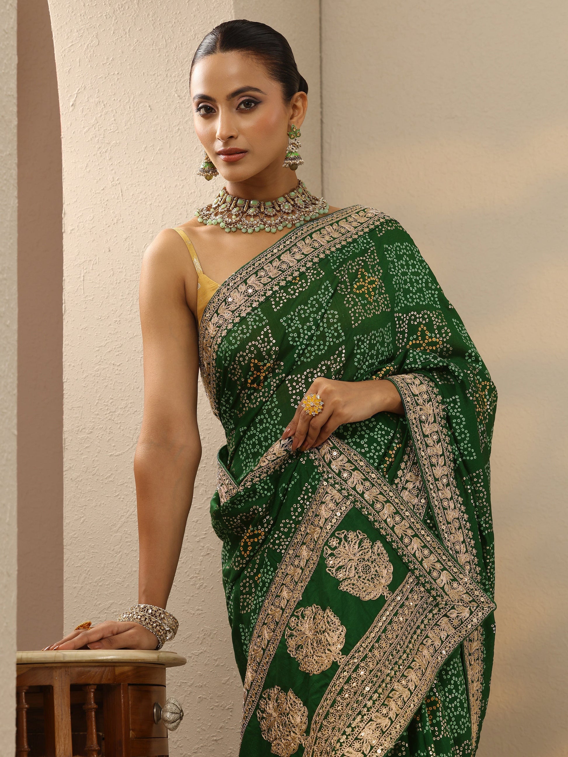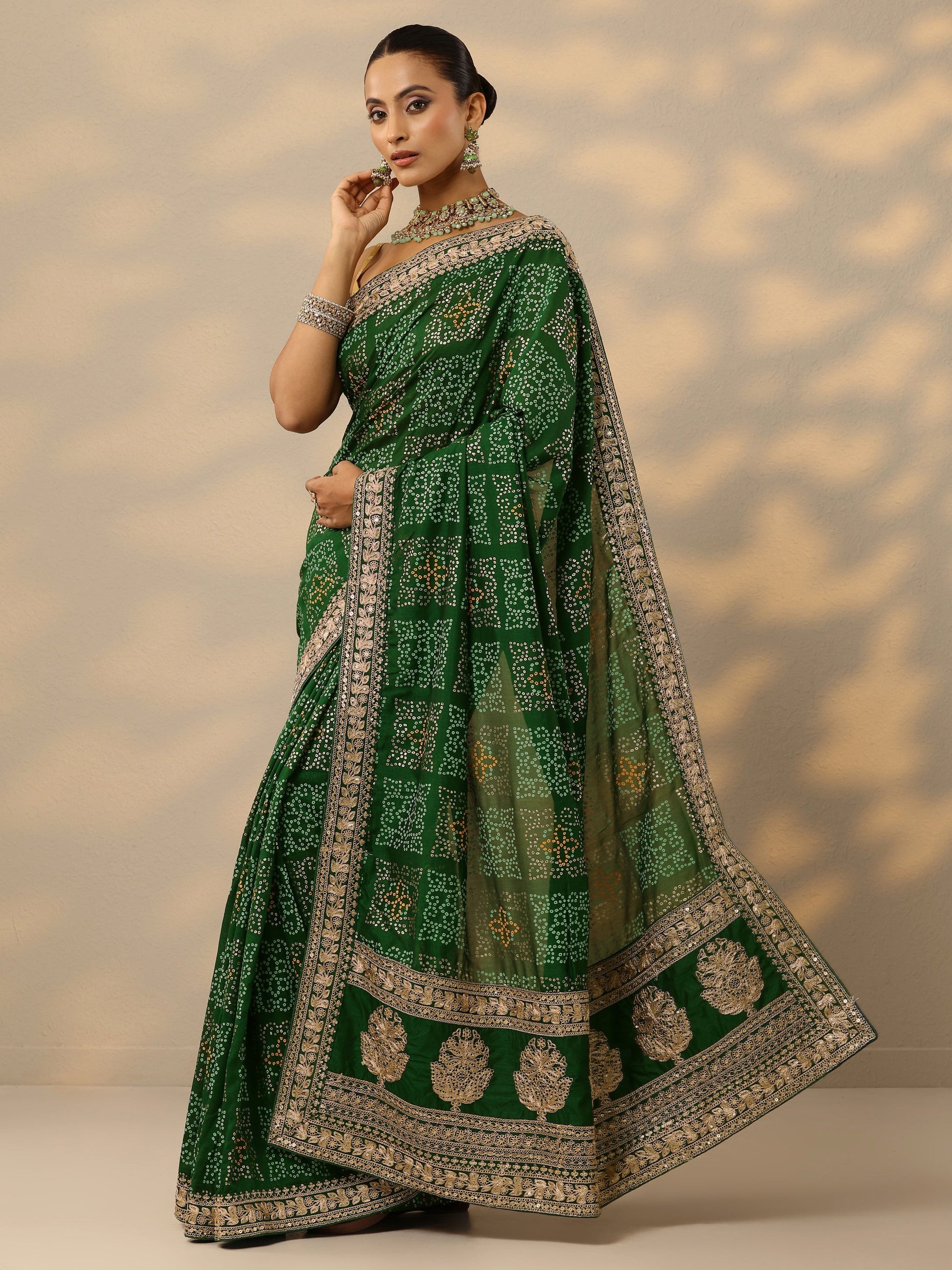 Green Bandhani Printed Silk Blend Saree With Unstitched Blouse Piece