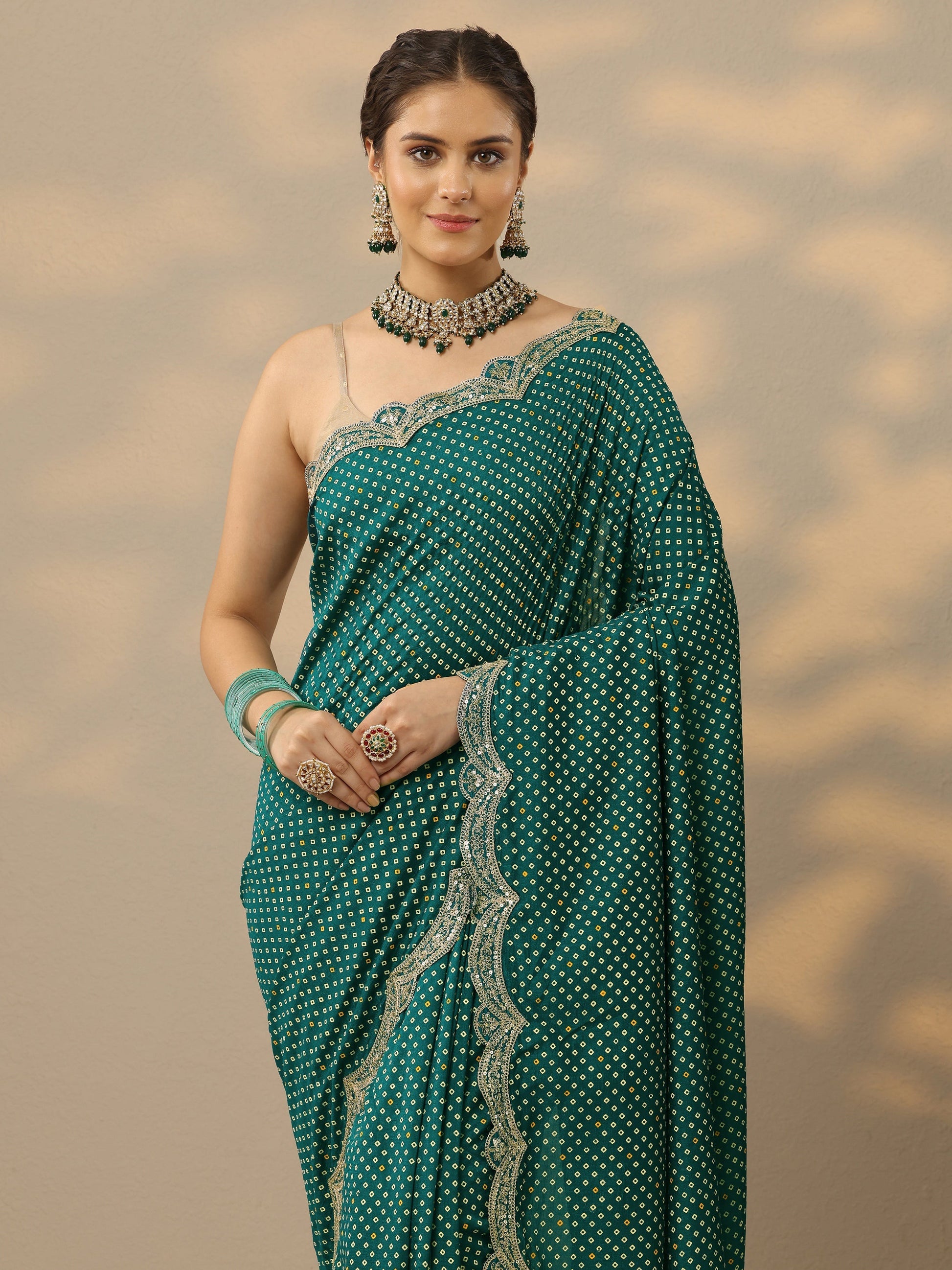 Green Bandhani Printed Silk Blend Saree With Unstitched Blouse Piece