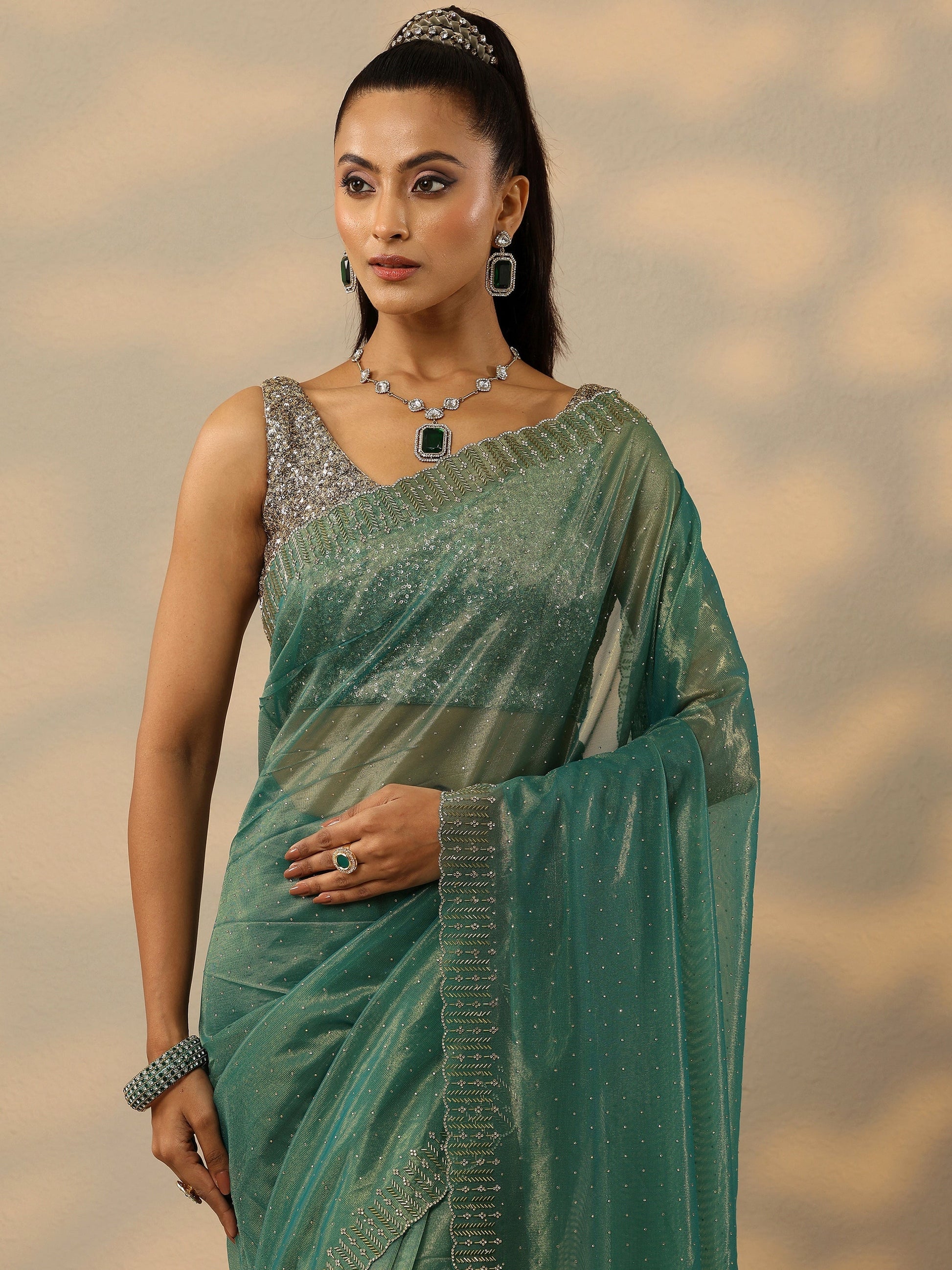 Green Embellished Nylon Saree With Unstitched Blouse Piece
