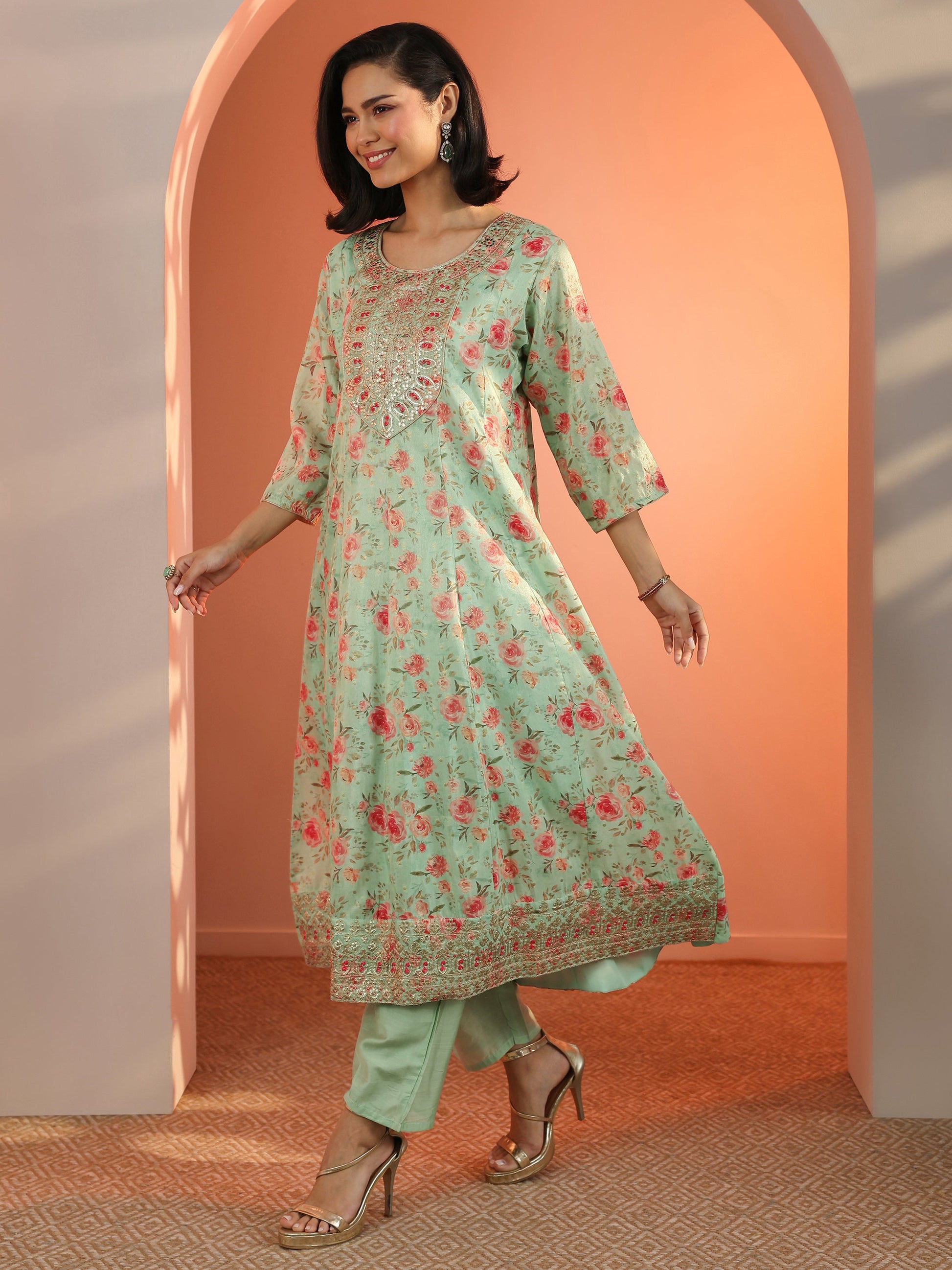 Green Embellished Silk Blend A-Line Suit Set With Dupatta