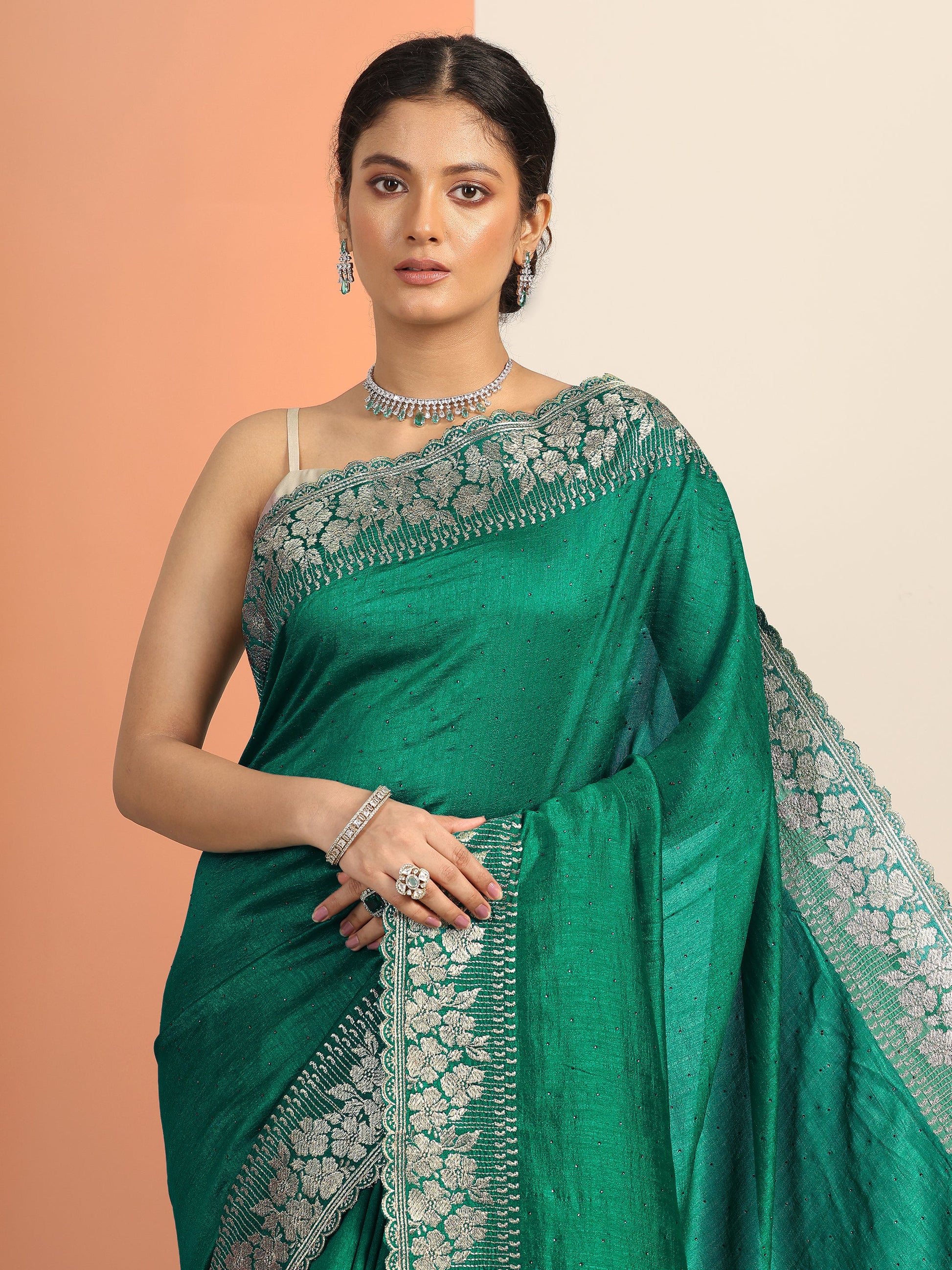 Green Embellished Silk blend Saree With Unstitched Blouse Piece