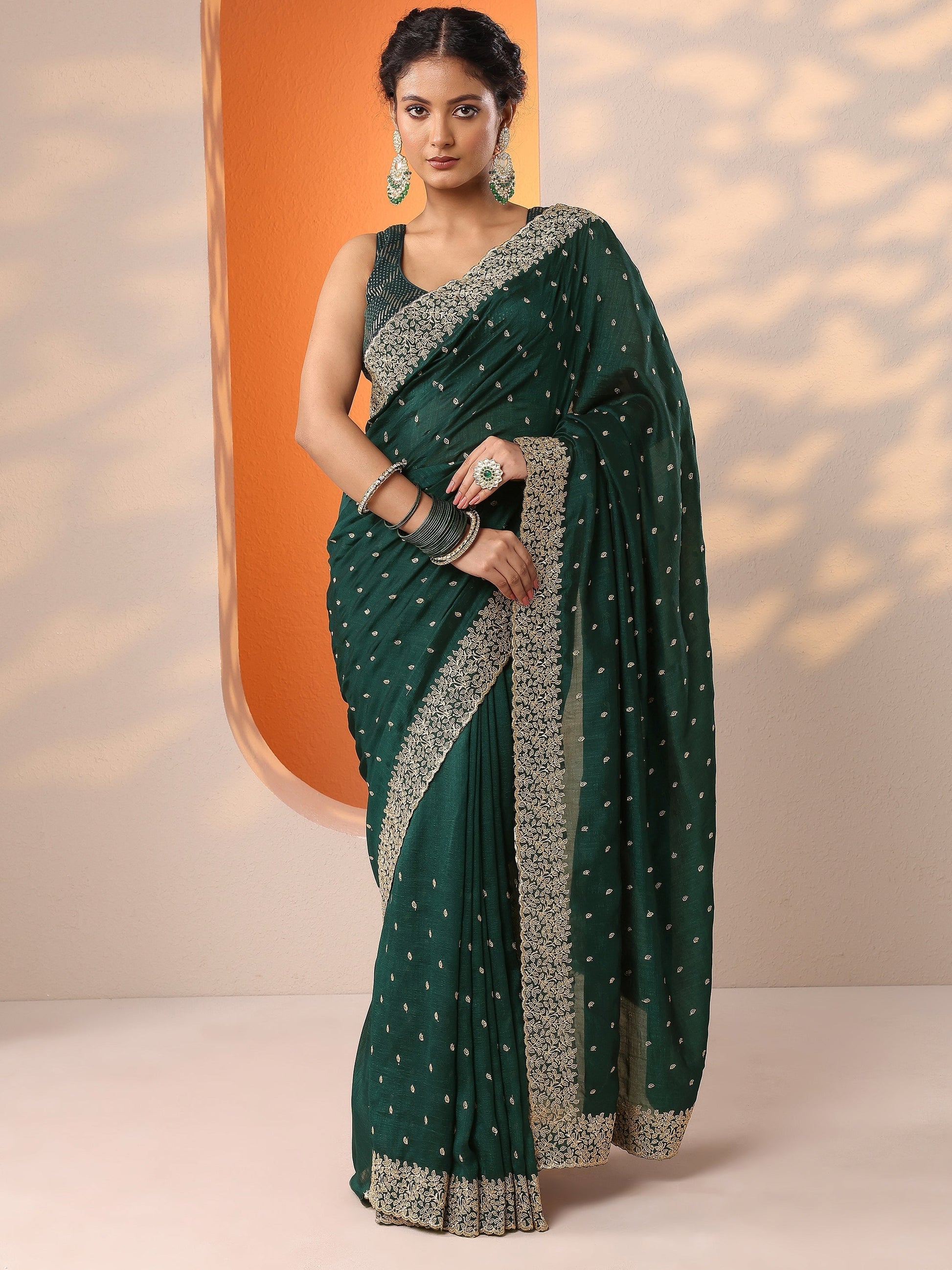 Green Embellished Silk Blend Saree With Unstitched Blouse Piece