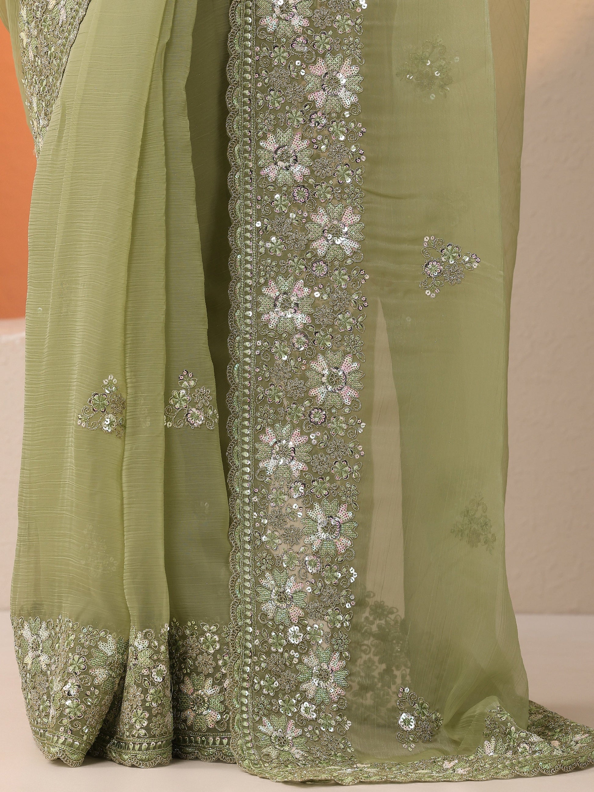Green Embroidered Chinon Saree With Unstitched Blouse Piece