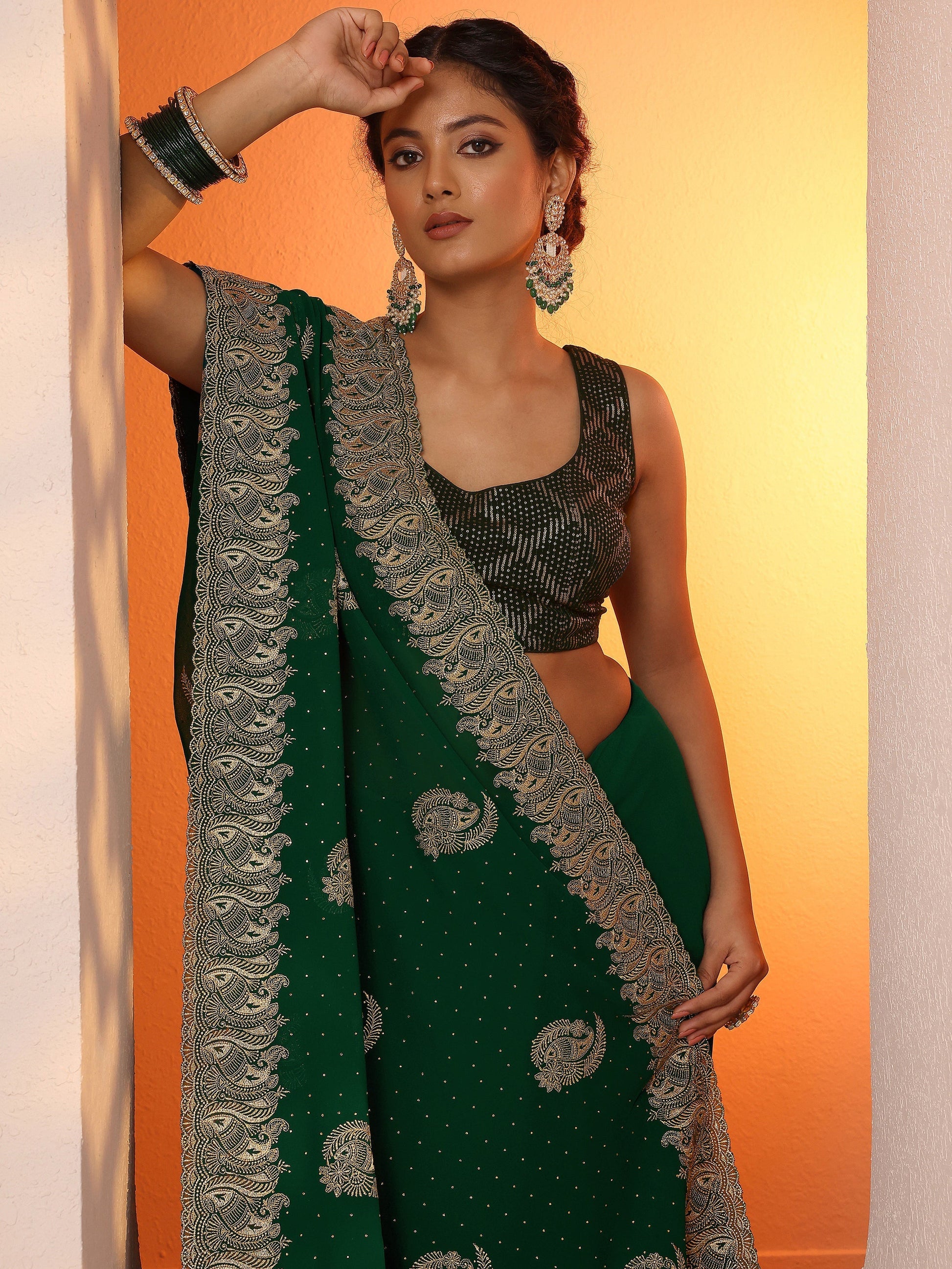 Our Green Georgette saree features captivating embellishments. Complemented with a Stitched Blouse. This charming saree is perfect for festive occasions.