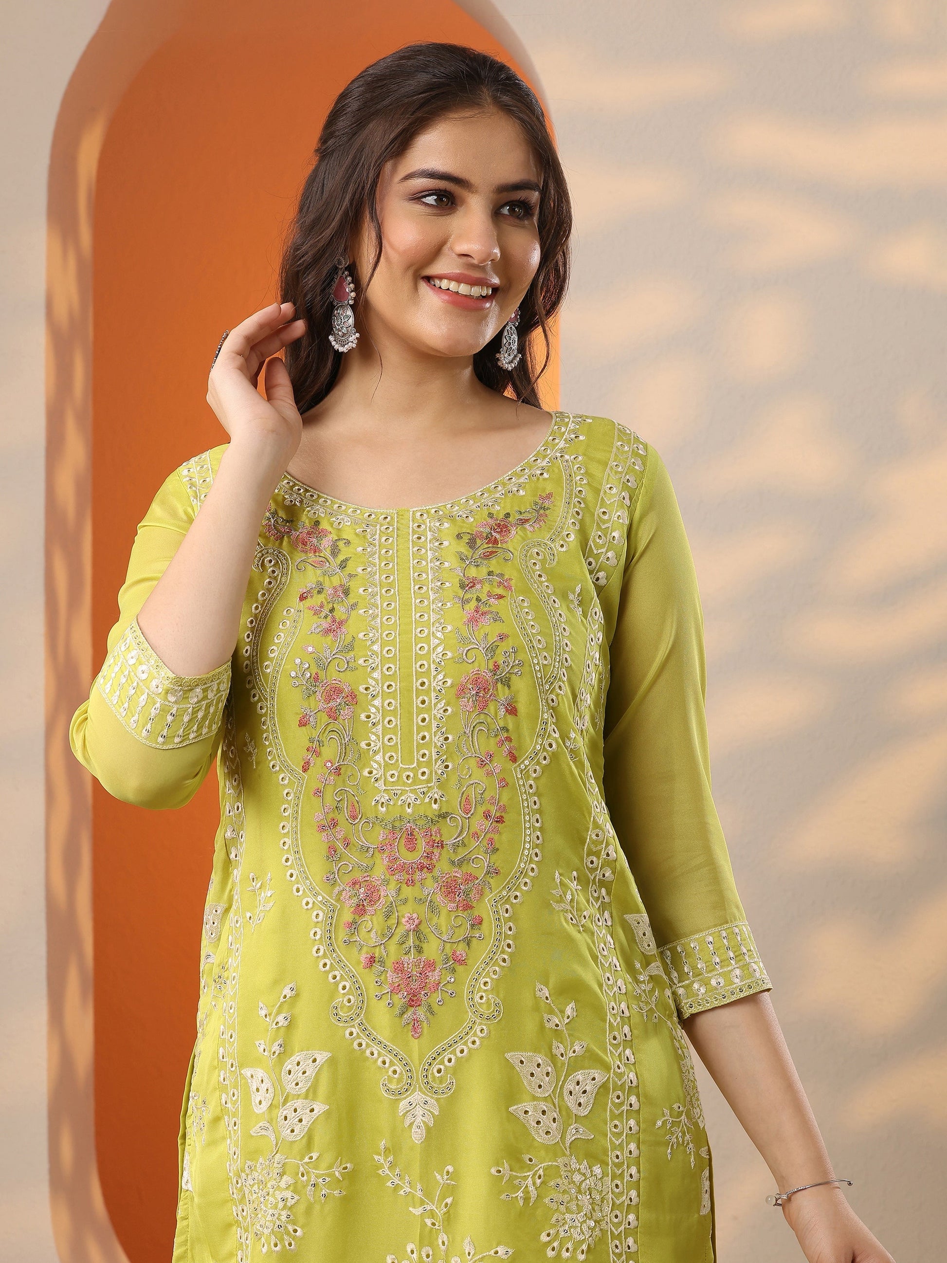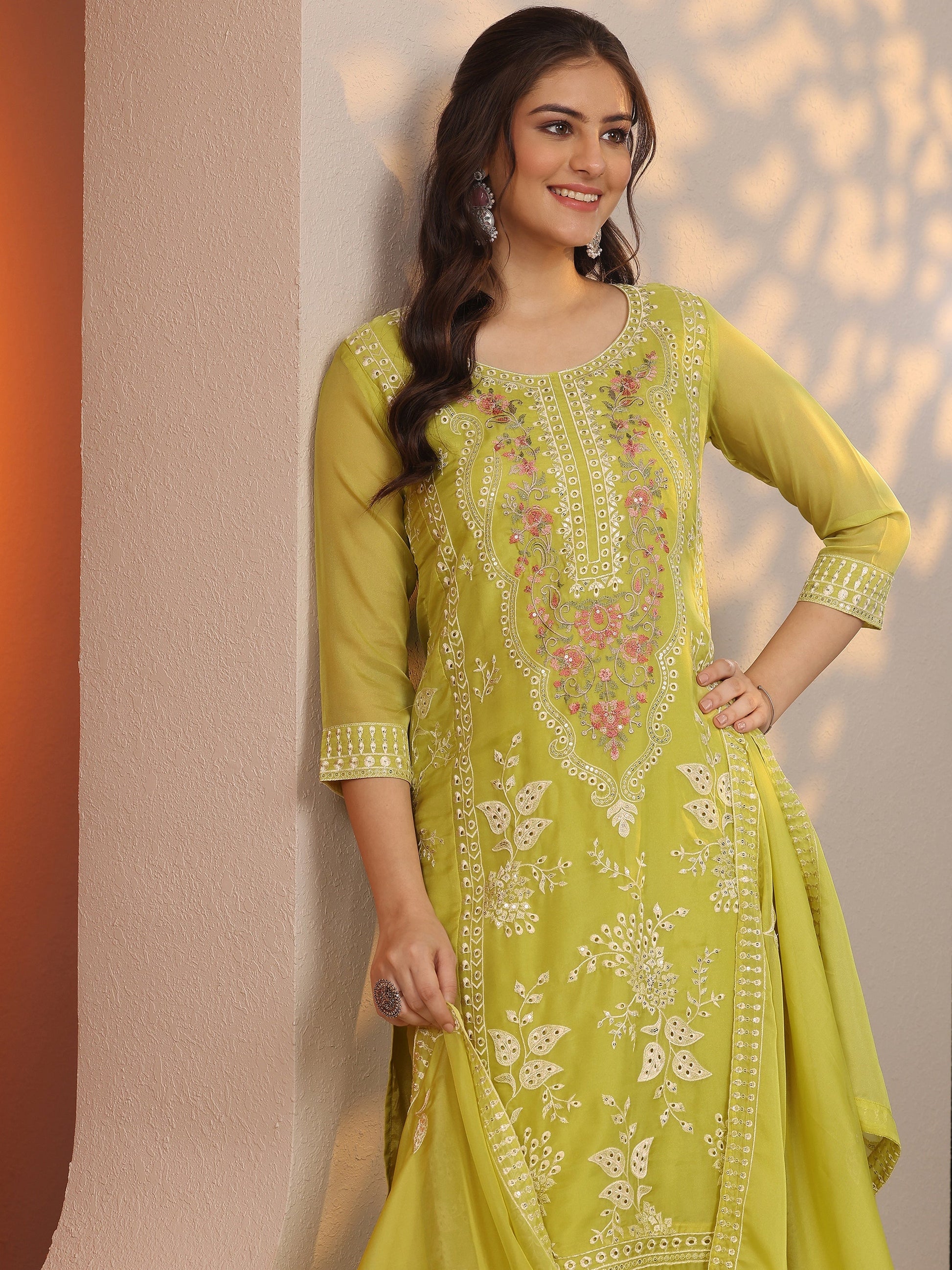 Green Embroidered Organza Straight Suit Set With Dupatta