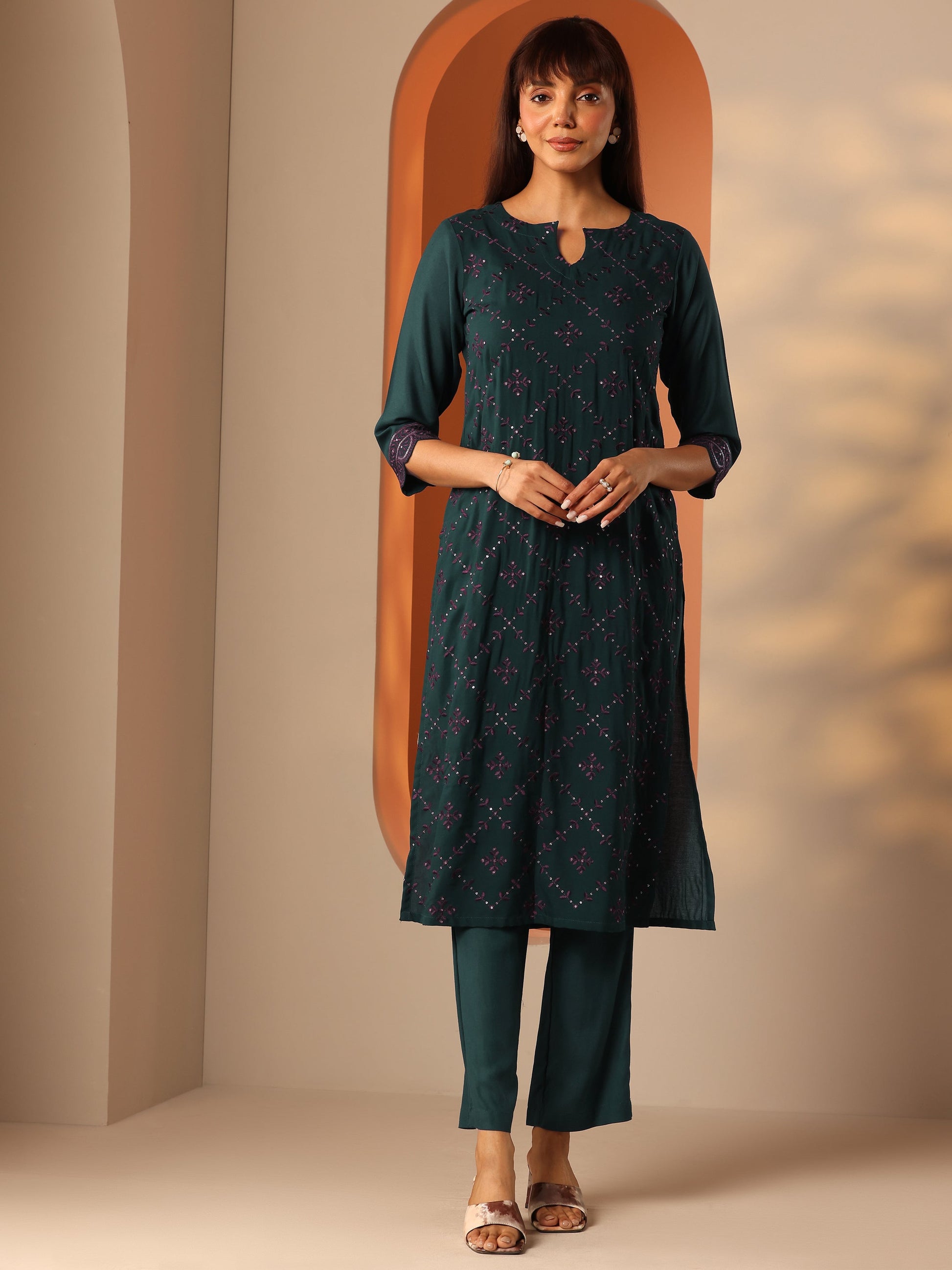 Our 2-piece Green Rayon Straight-fit features a Keyhole Neckline, Regular Sleeves, and statement Yoke. Complemented with Straight Pants with a Partially Elasticated waistband and 2 pockets. Adorned with Floral Embroidered, this style is perfect for Semi festive wear.