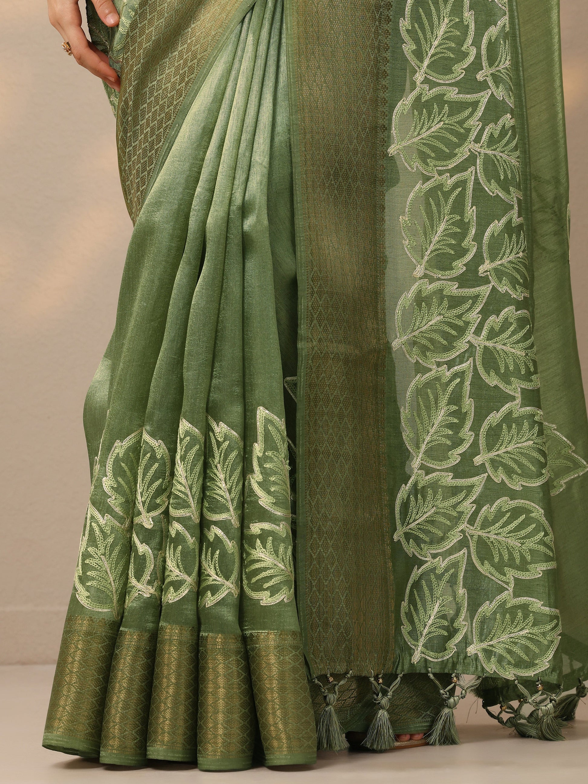 Green Embroidered Silk Blend Saree With Unstitched Blouse Piece