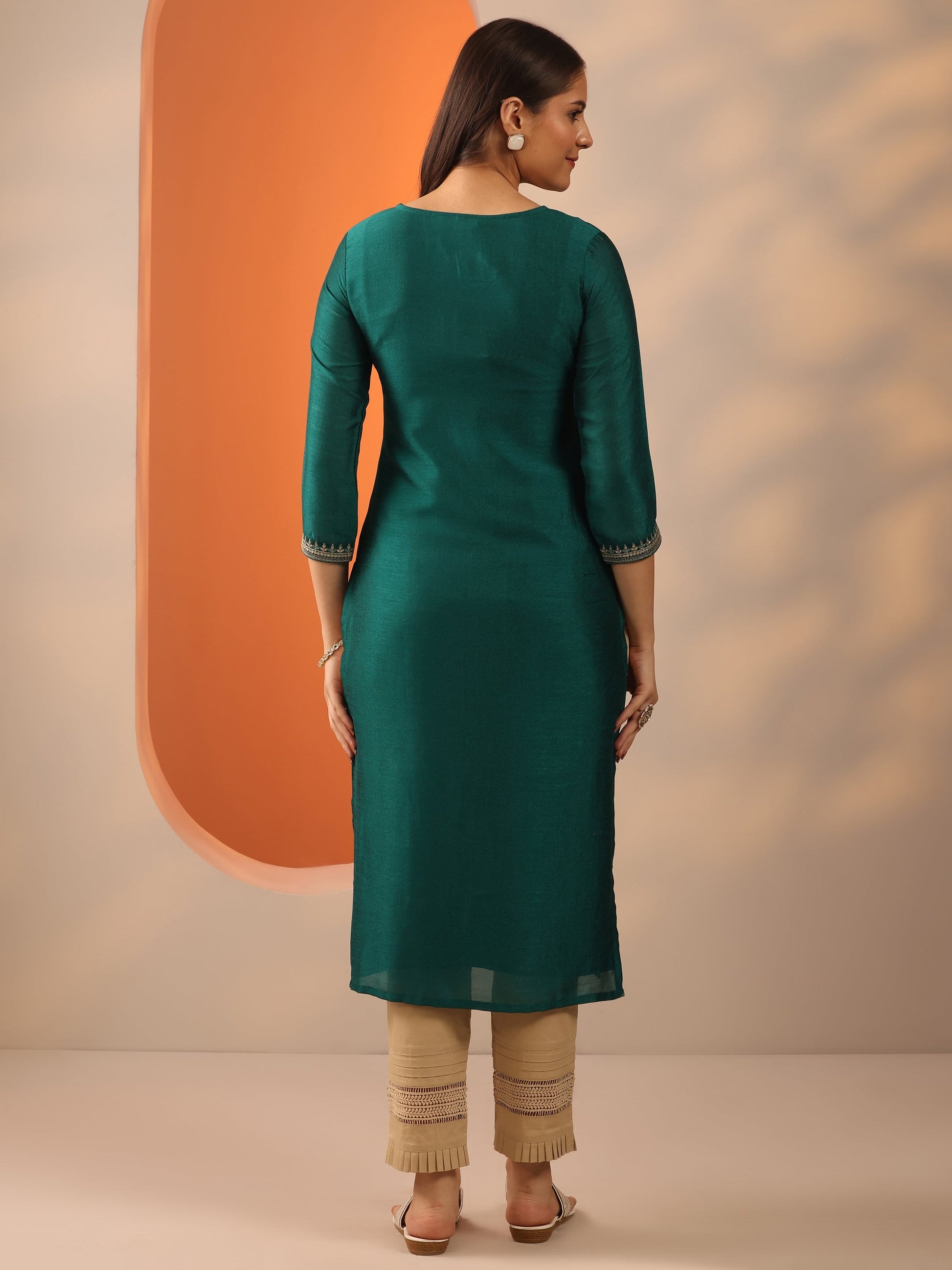 Green Embroidered Silk Blend Straight Kurta