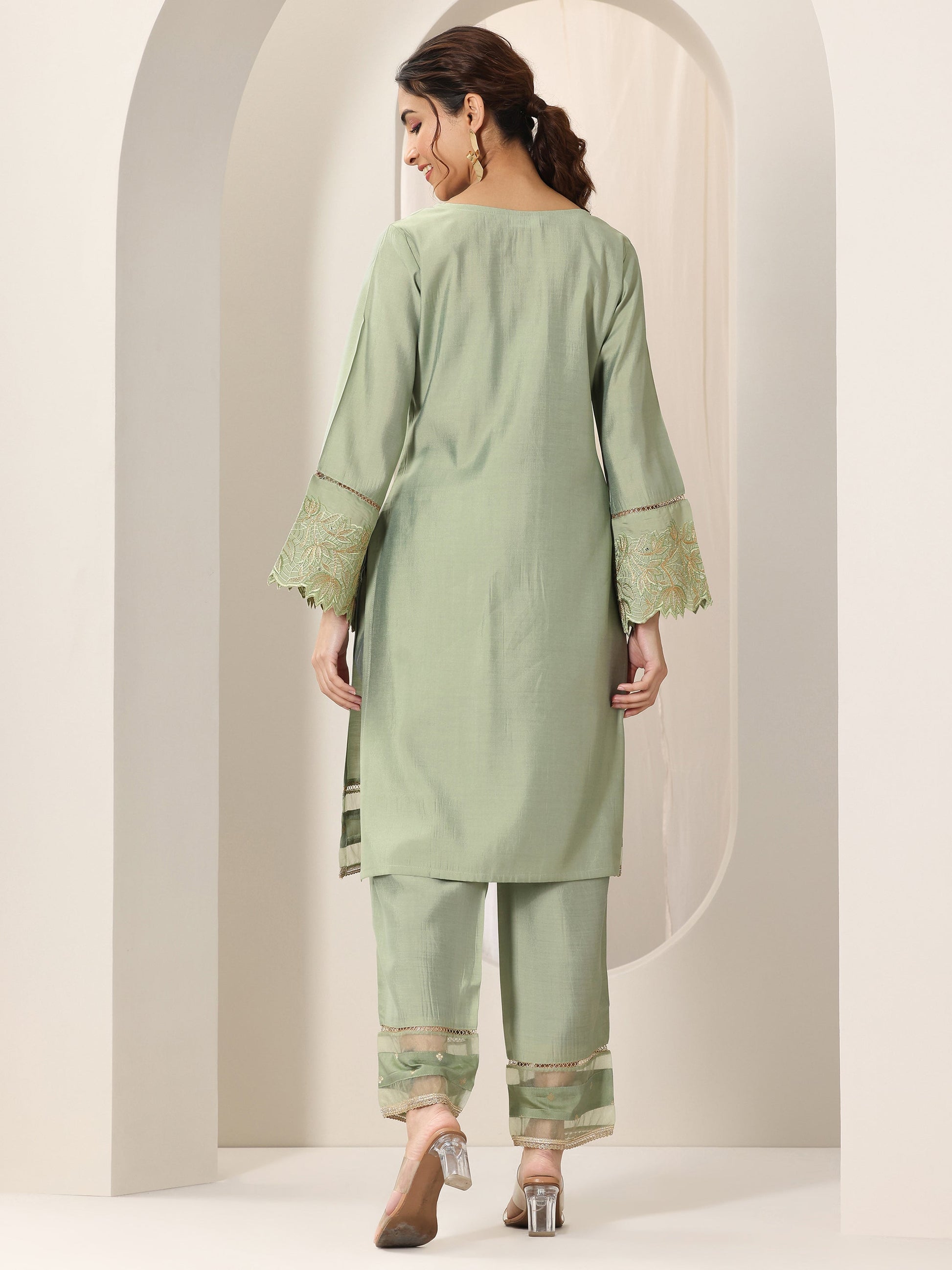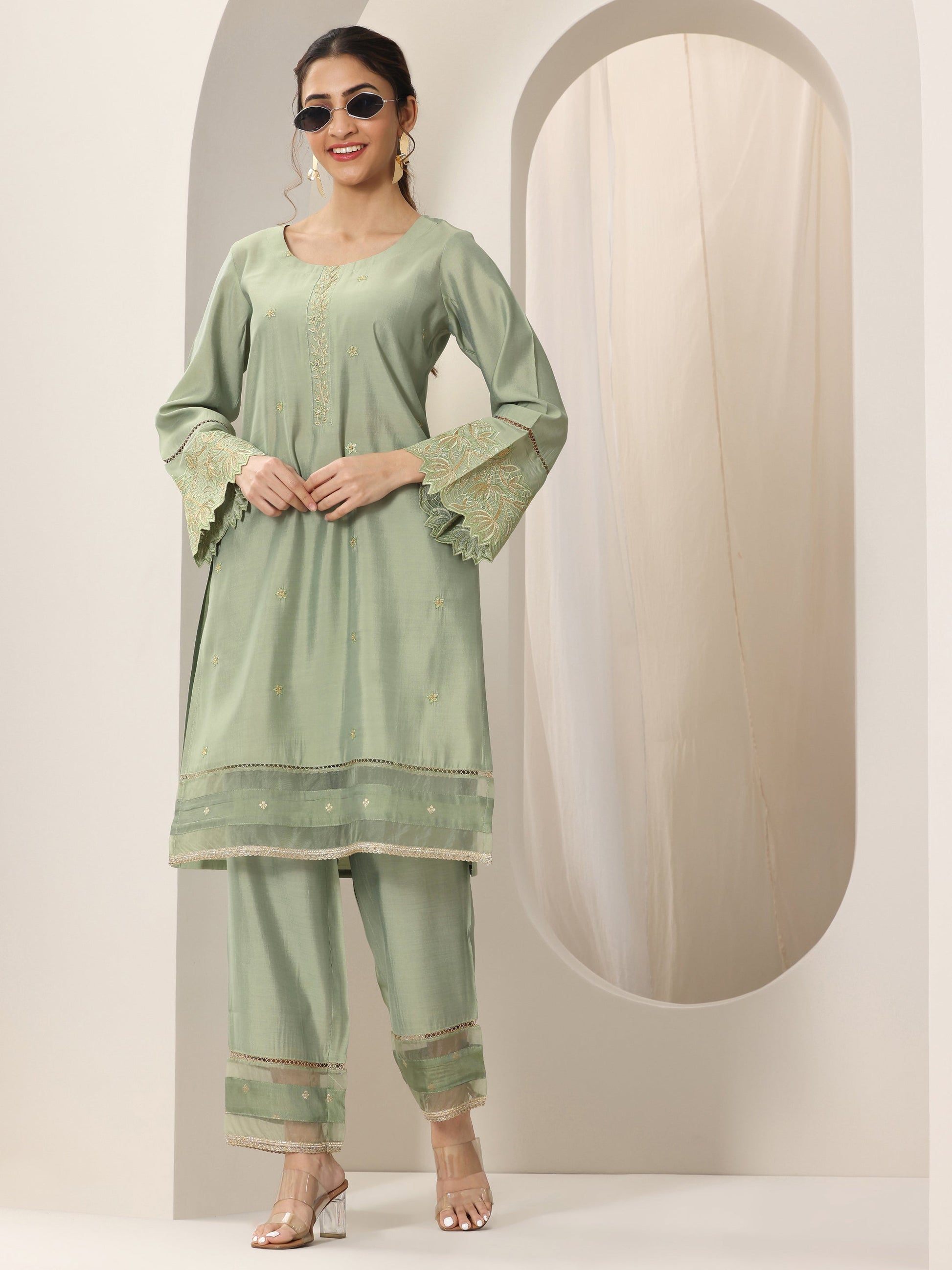 Our 2-piece green embroidered silk blend straight kurta set features a kurta with a round neckline and three-quarter flared sleeves. Complemented with matching straight pants with a partially elasticated waistband and roomy pockets. Highlighted with floral prints and fabric-trim accents, this style is perfect for festive celebrations.