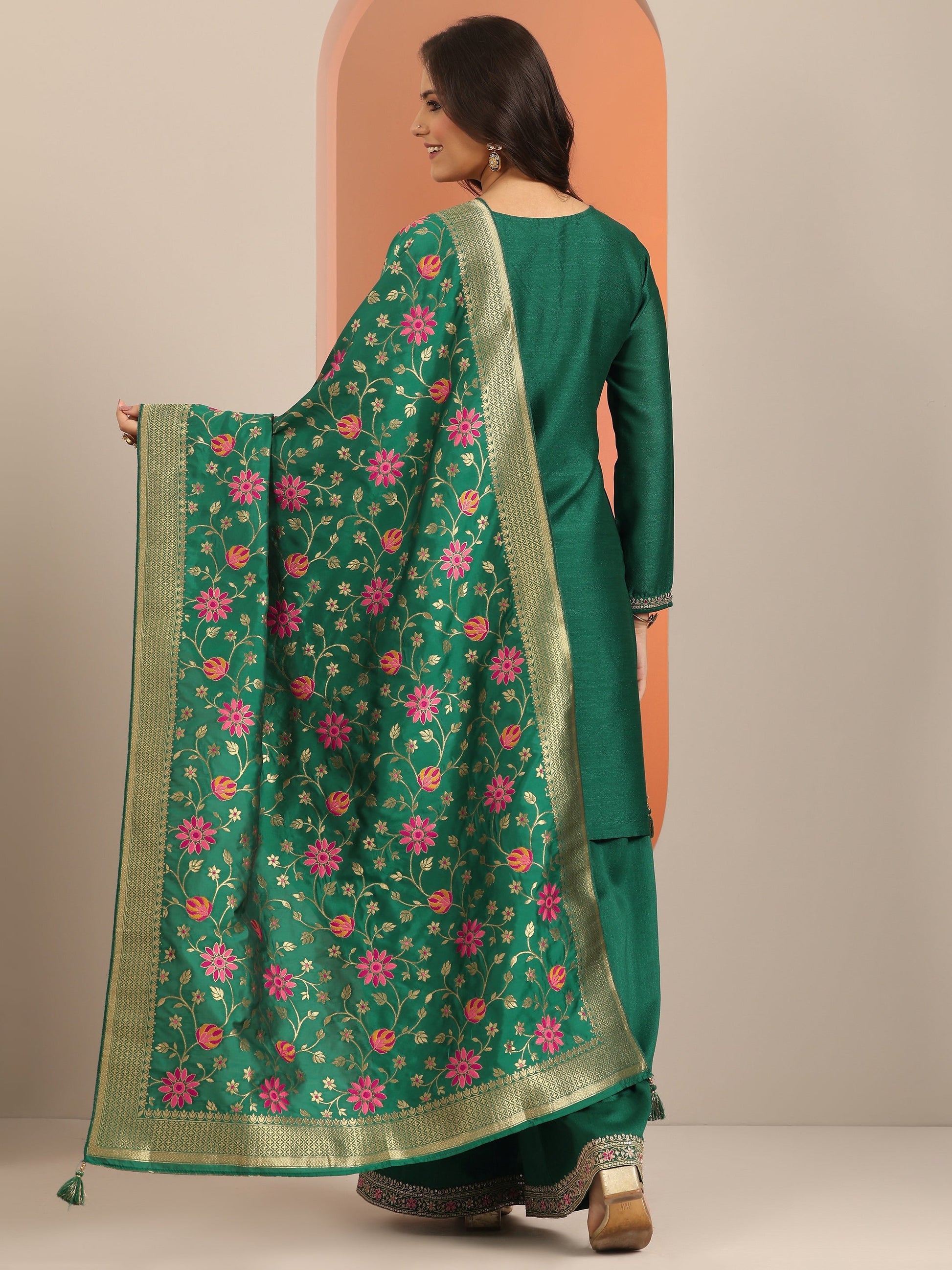 Green Embroidered Silk Blend Straight Suit Set With Dupatta