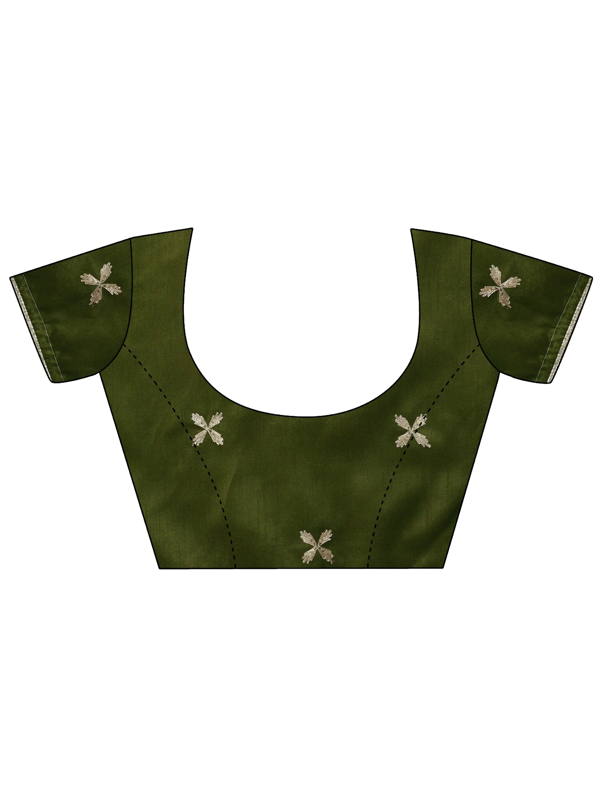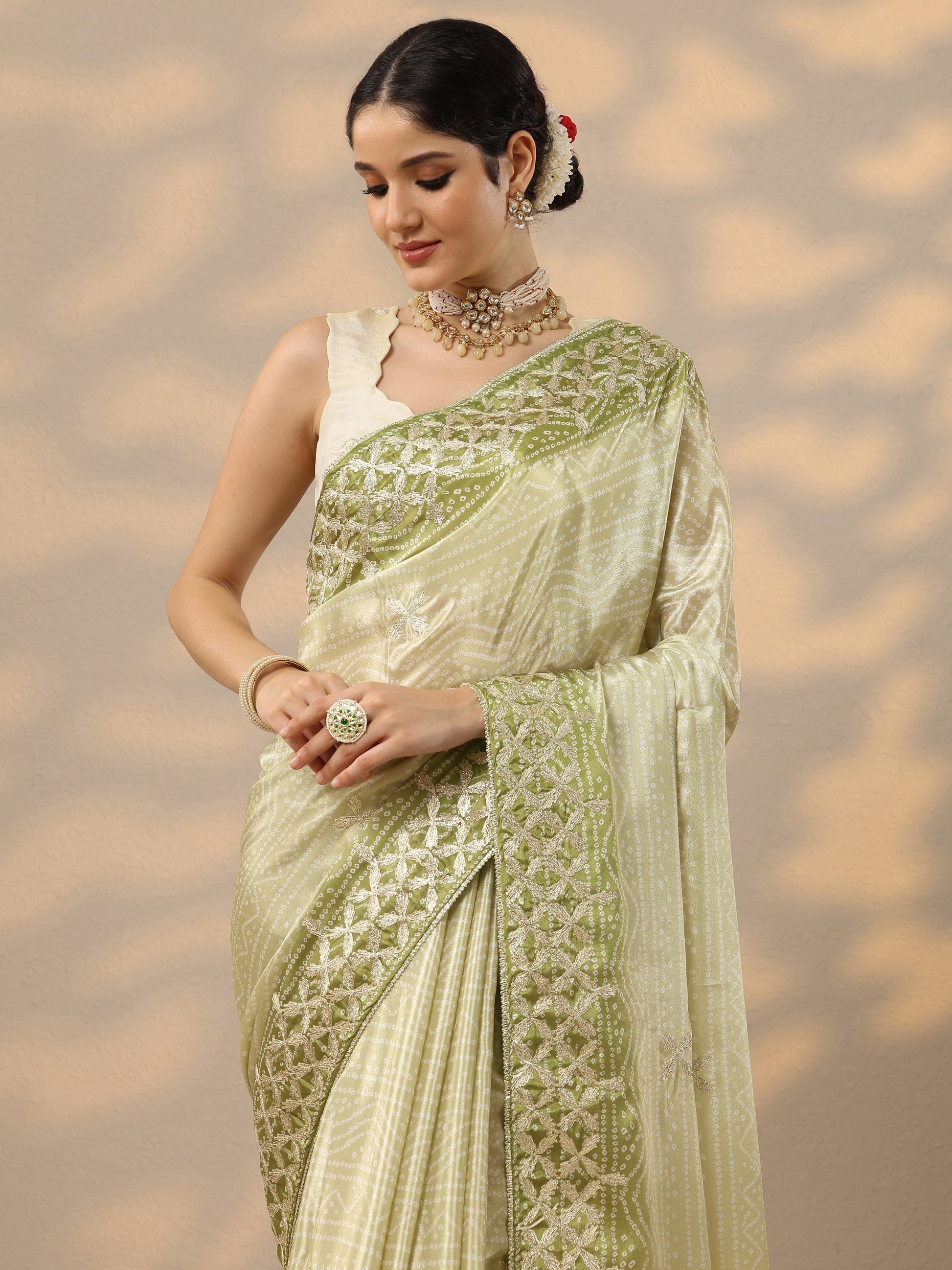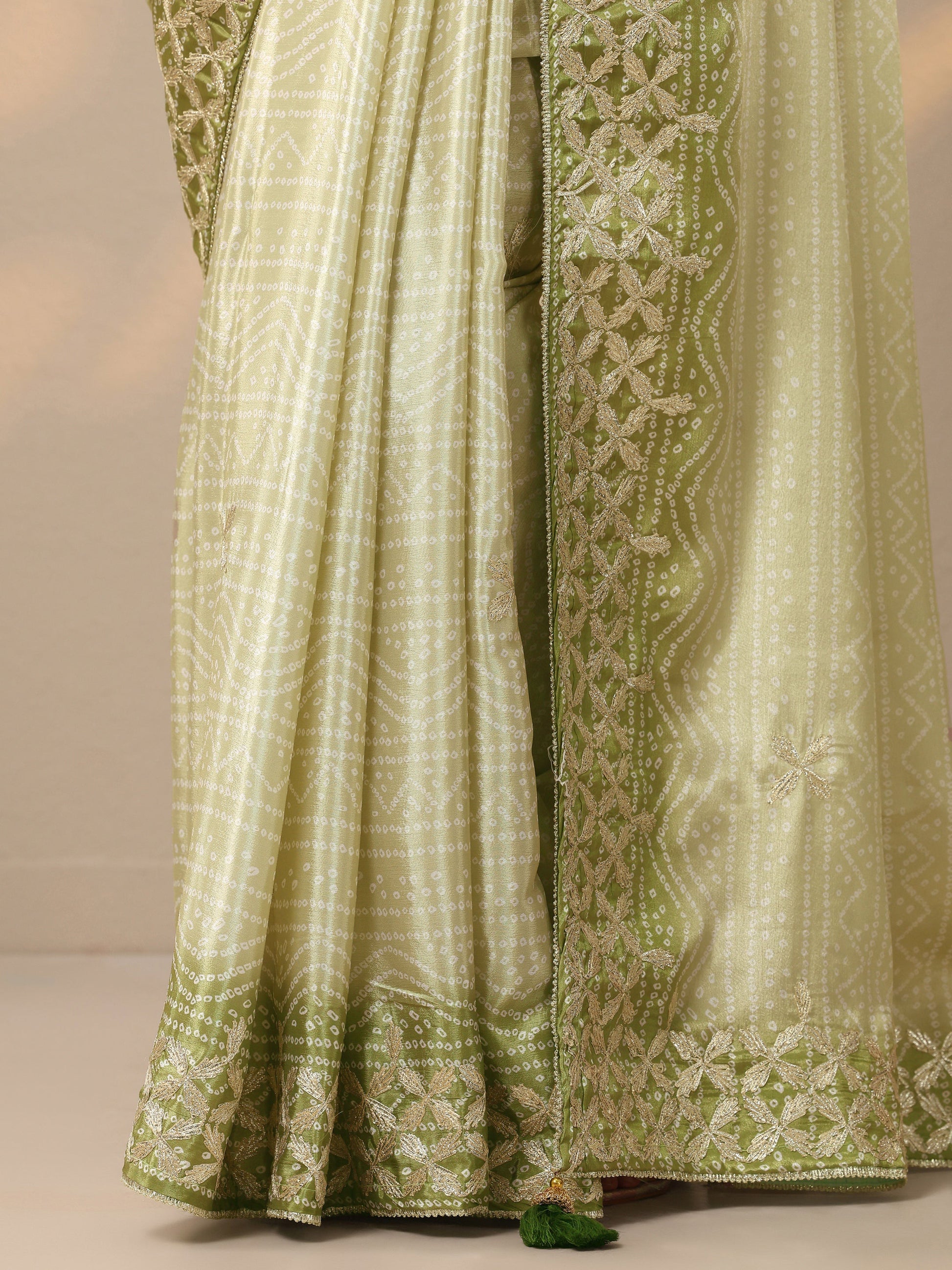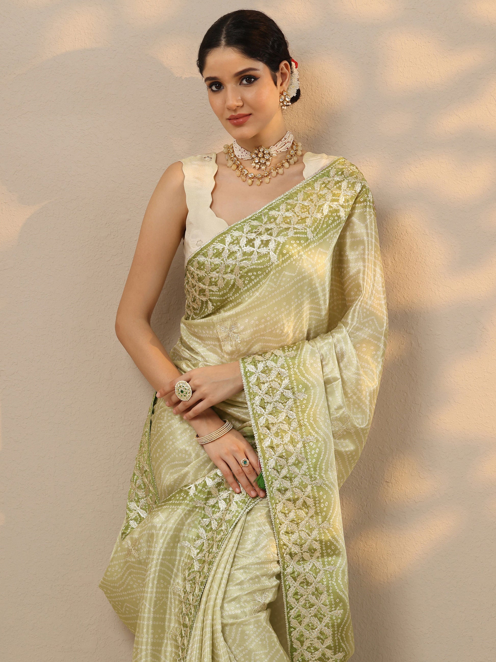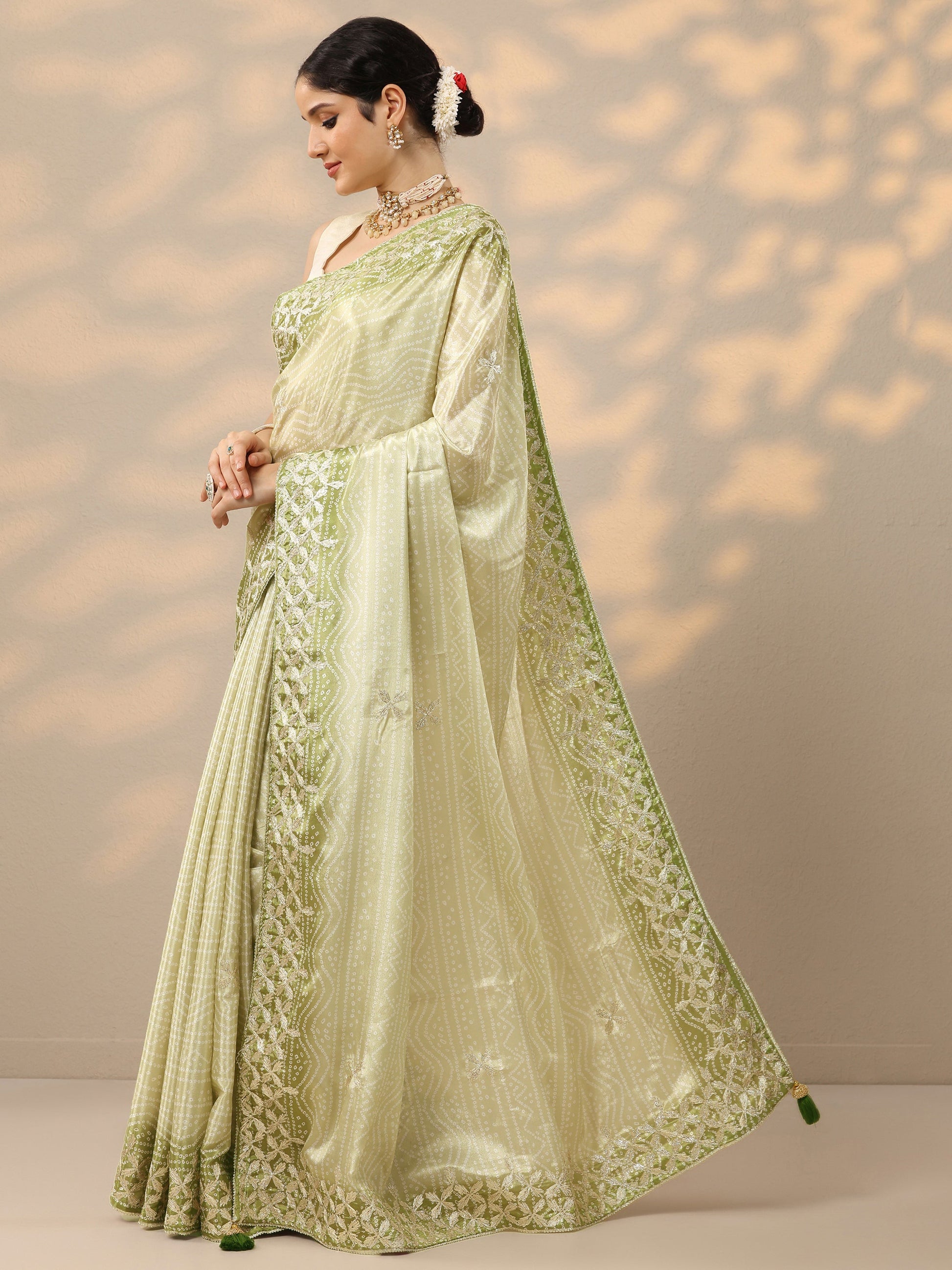 Green Printed Banarasi Chinon Saree With Unstitched Blouse Piece