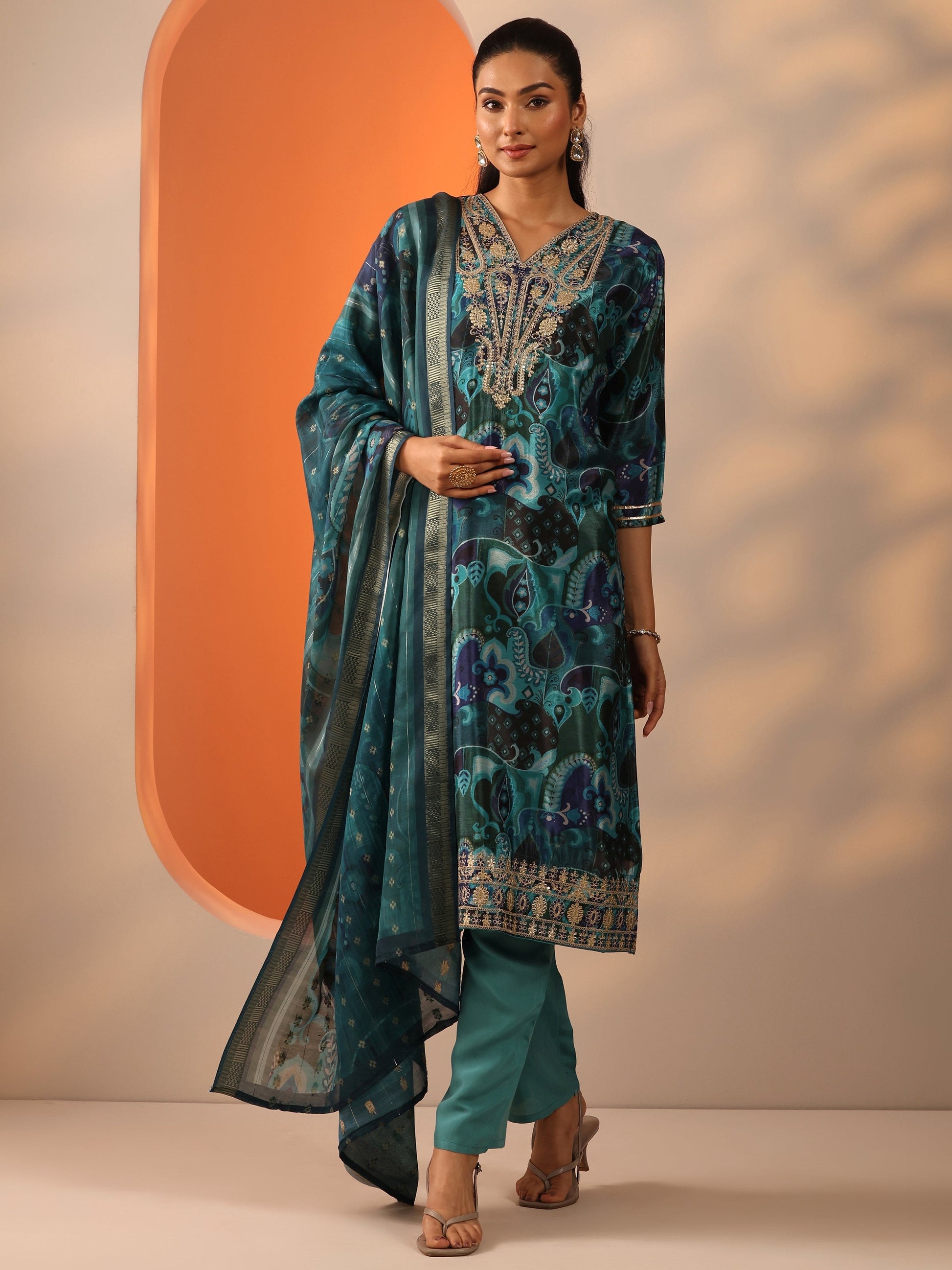 Our 3-piece Teal Chinon Straight-Fit Kurta Set features a V-Neckline, Regular Sleeves, and statement yoke. Complemented with Lining and Straight Pants with a Partially Elasticated waistband and 2 pockets, and a Printed dupatta. Adorned with ethnic motif, this style is perfect for Festive occasions.