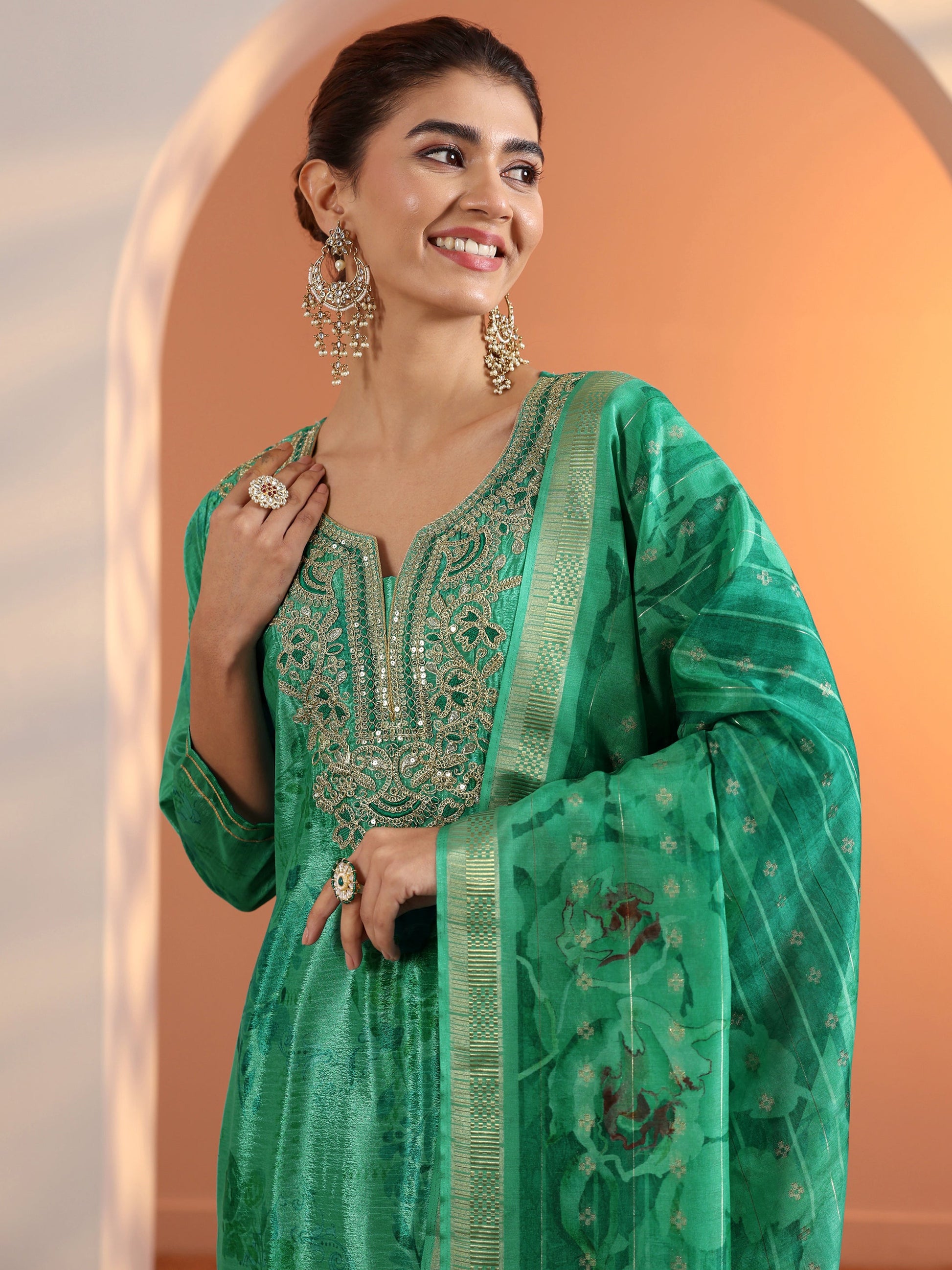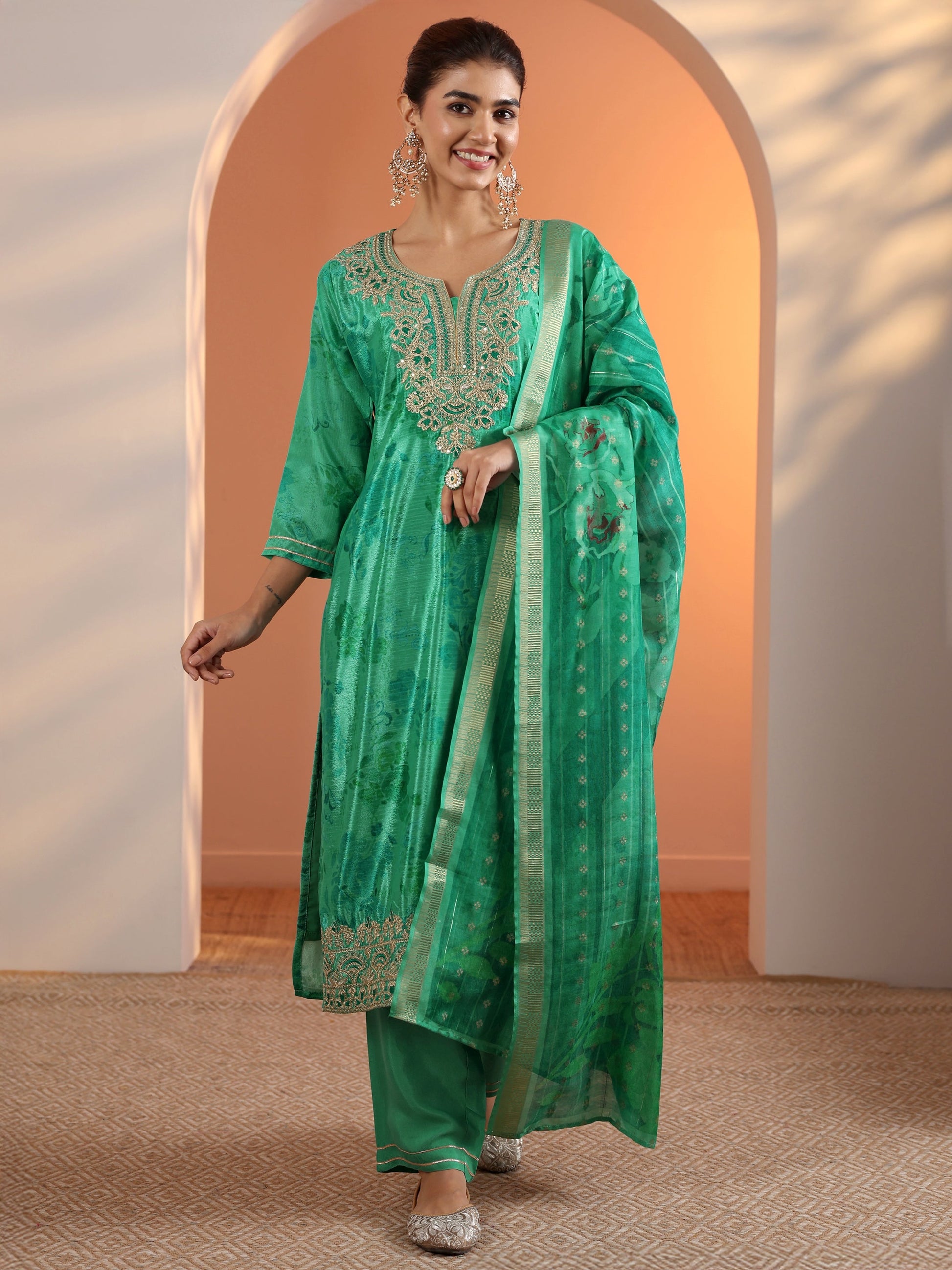 Green Printed Chinon Straight Suit Set With Dupatta