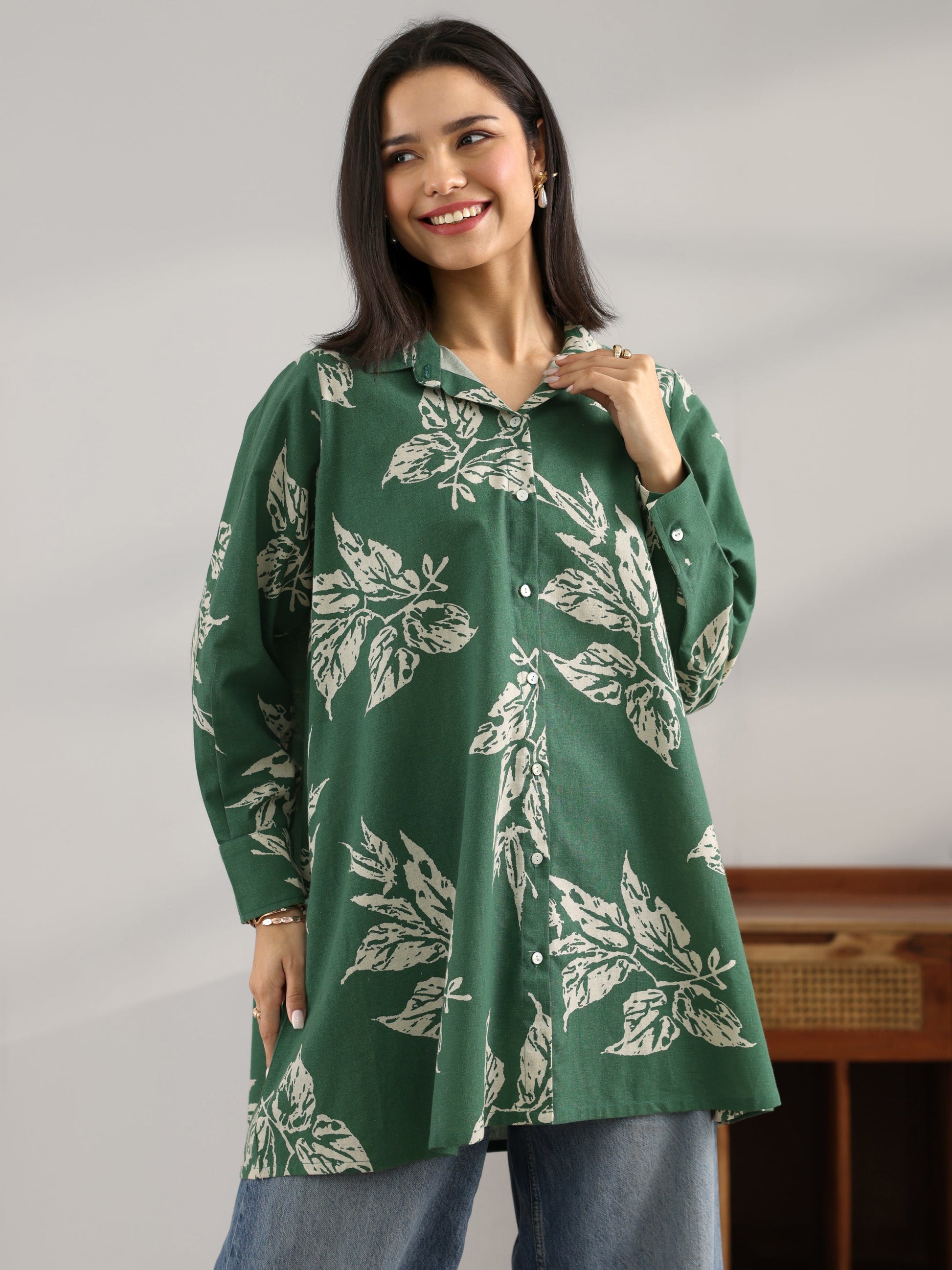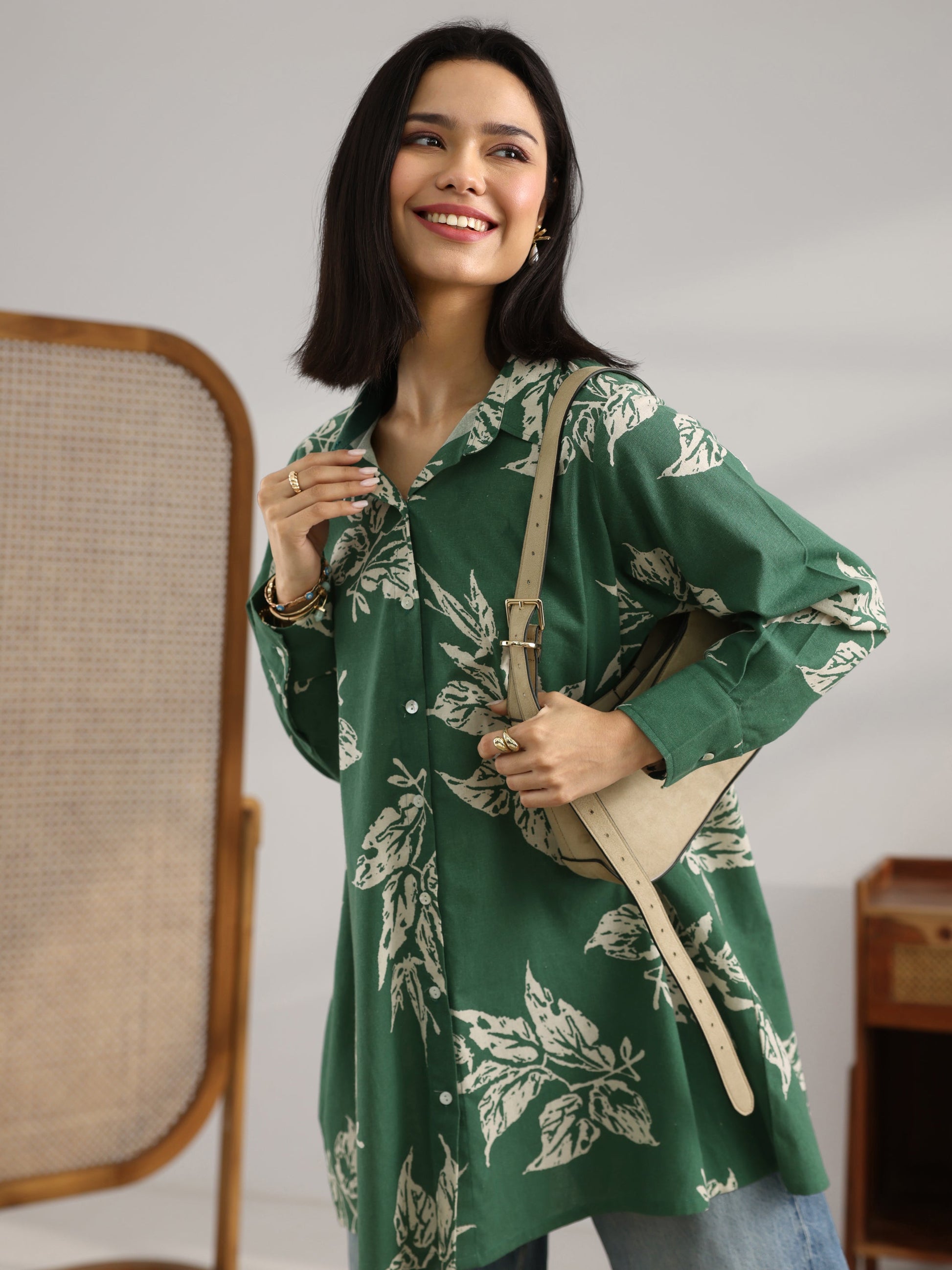 Green Printed Cotton A-Line Shorti Kurti