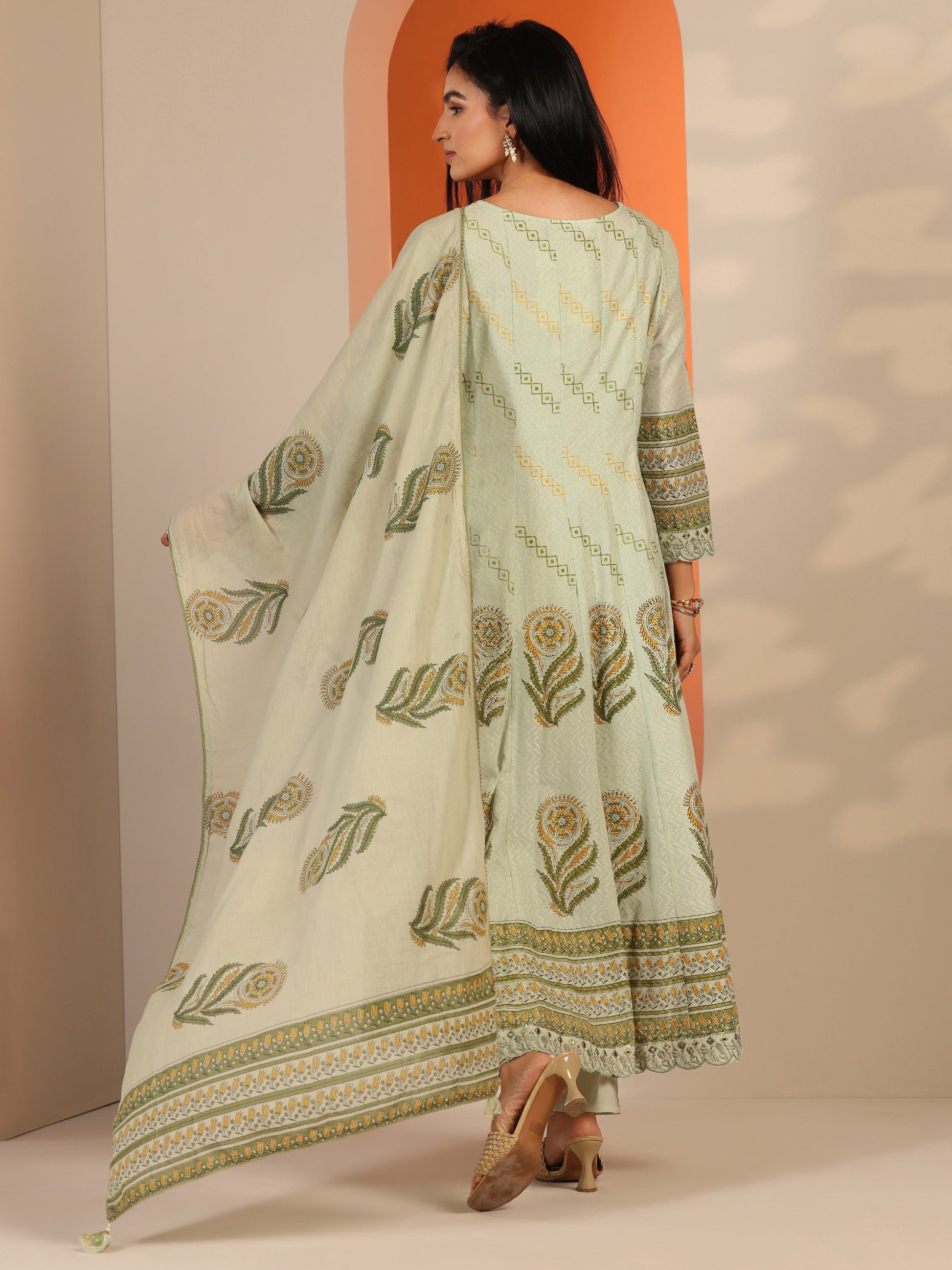 Green Printed Cotton Anarkali Suit Set With Dupatta