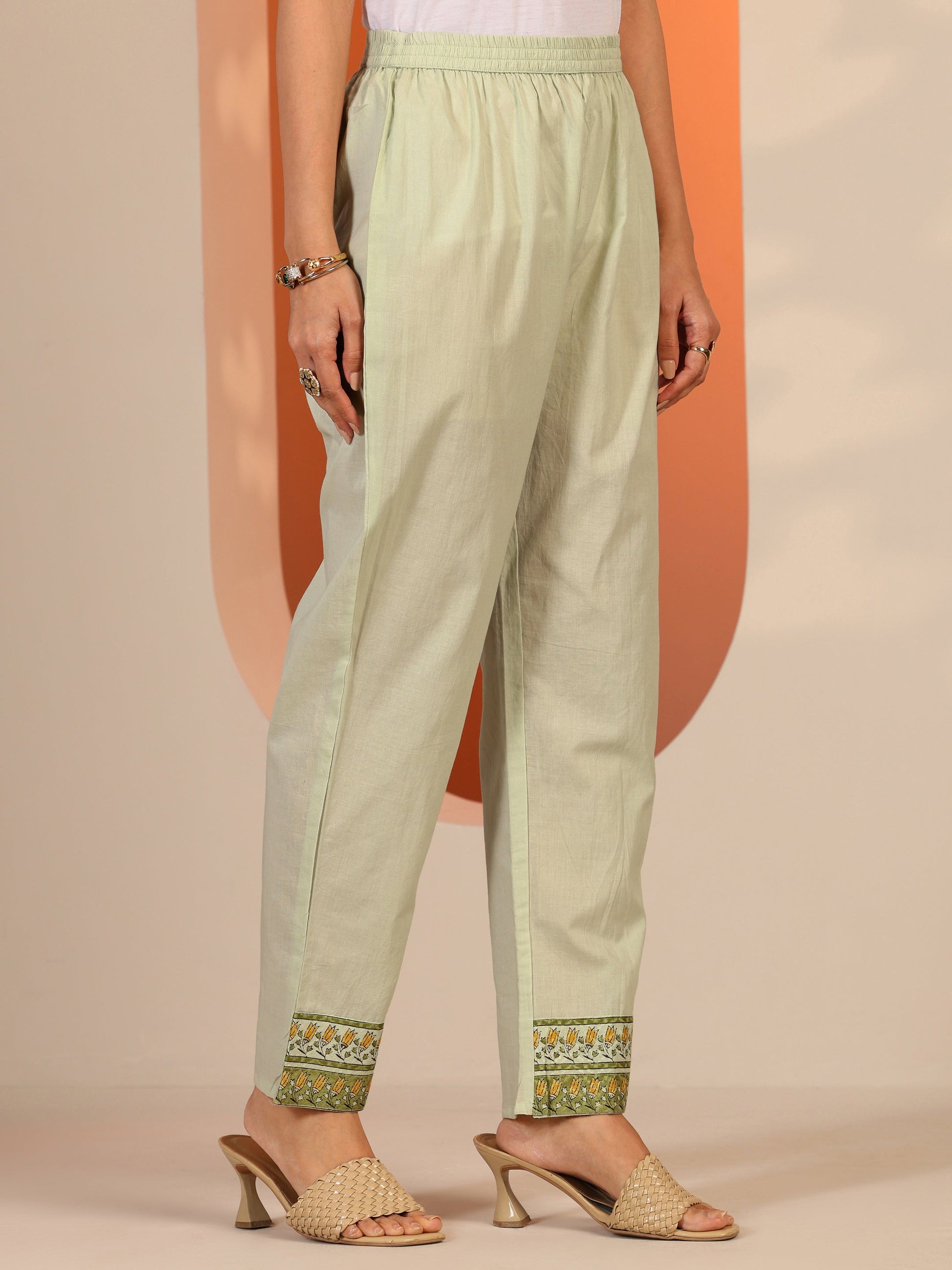 Our 3-piece green cotton Anarkali kurta set features a V-neckline, regular sleeves, and a statement yoke. Complemented with straight pants with a partially elasticated waistband and 2 pockets, and an embroidered dupatta. Adorned with floral printed accents, this style is perfect for festive wear.