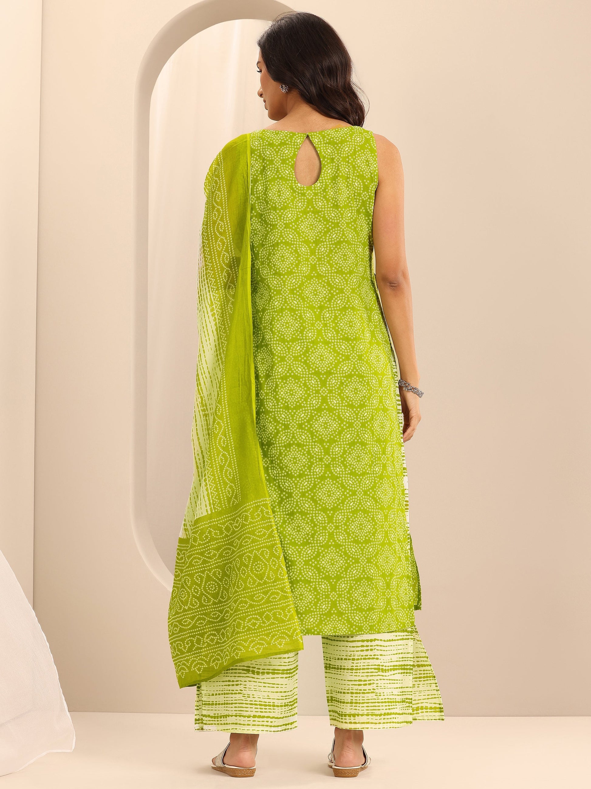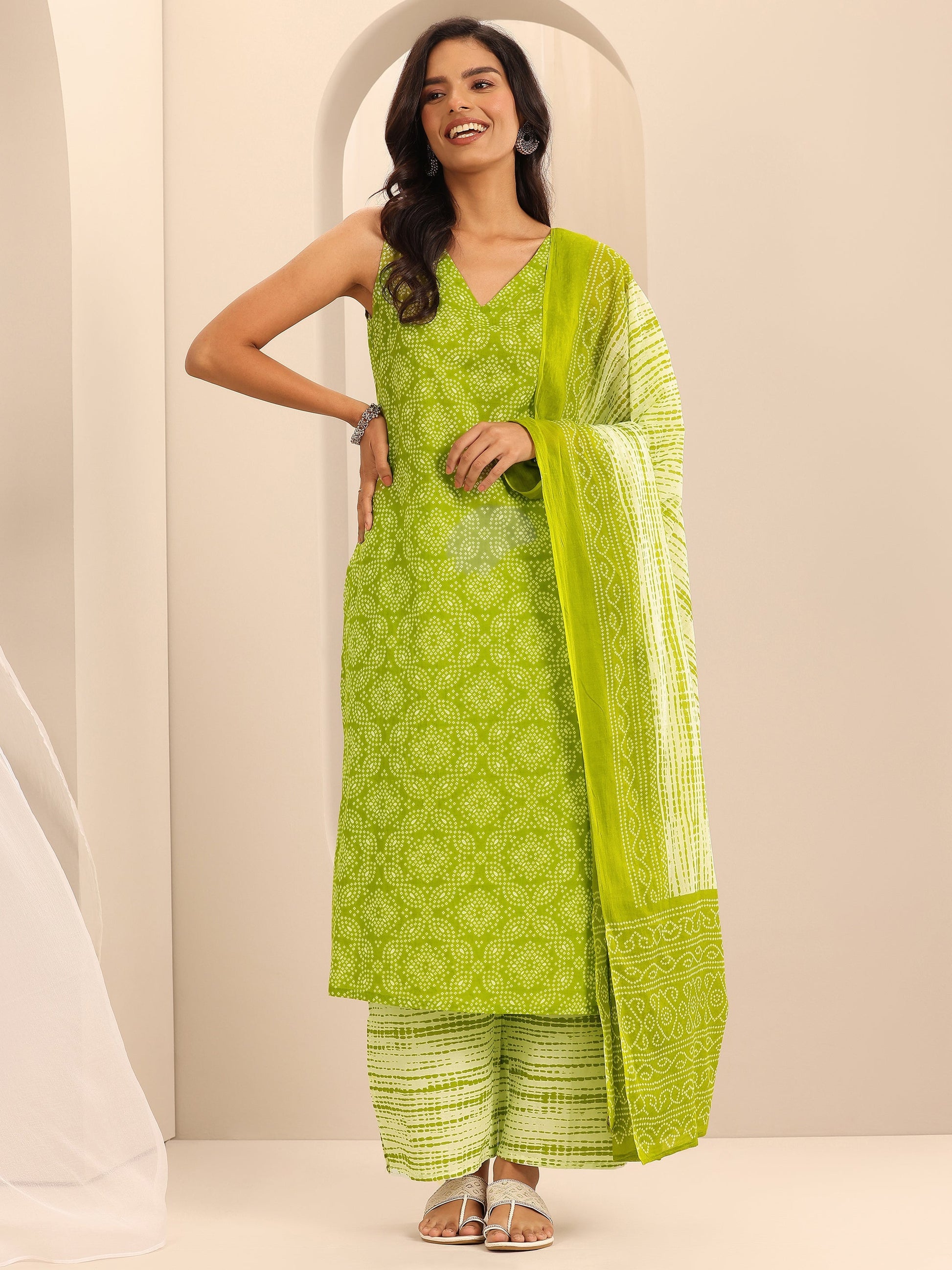 Our 3-piece lime green cotton straight-fit kurta set features a V-neckline and statement yoke. Complemented with palazzo pants with a partially Partially Elasticated waistband and a dupatta. Adorned with Bandhani inspired print, this style is perfect for casual wear.