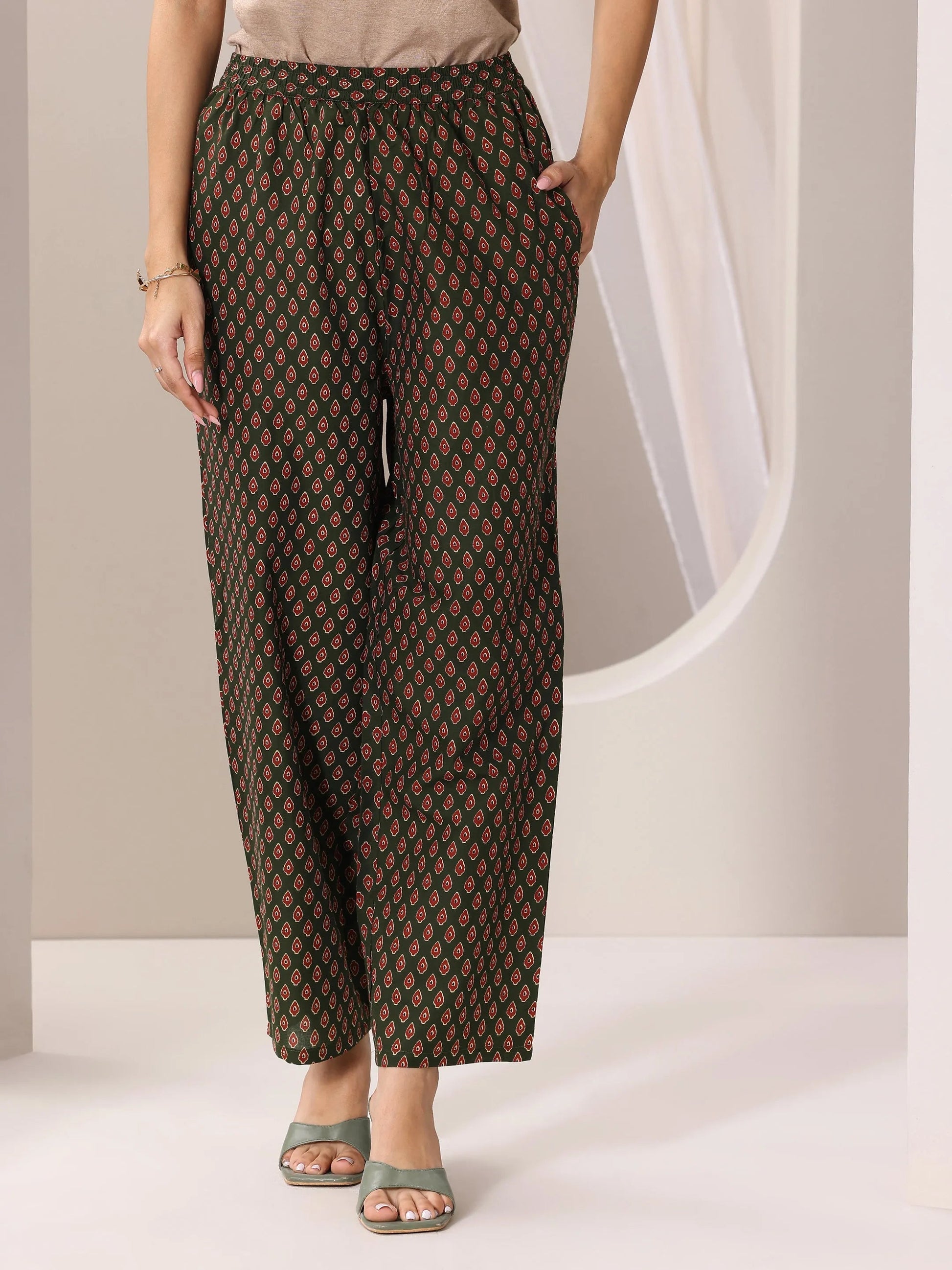 Our 3-piece green printed cotton straight suit set features a straight-fit kurta with a notched neckline and three-quarter sleeves. Complemented with straight trouser pants with a partially elasticated waistband and roomy pockets, and a matching dupatta. Adorned with ethnic motifs, this style is perfect for festive celebrations.