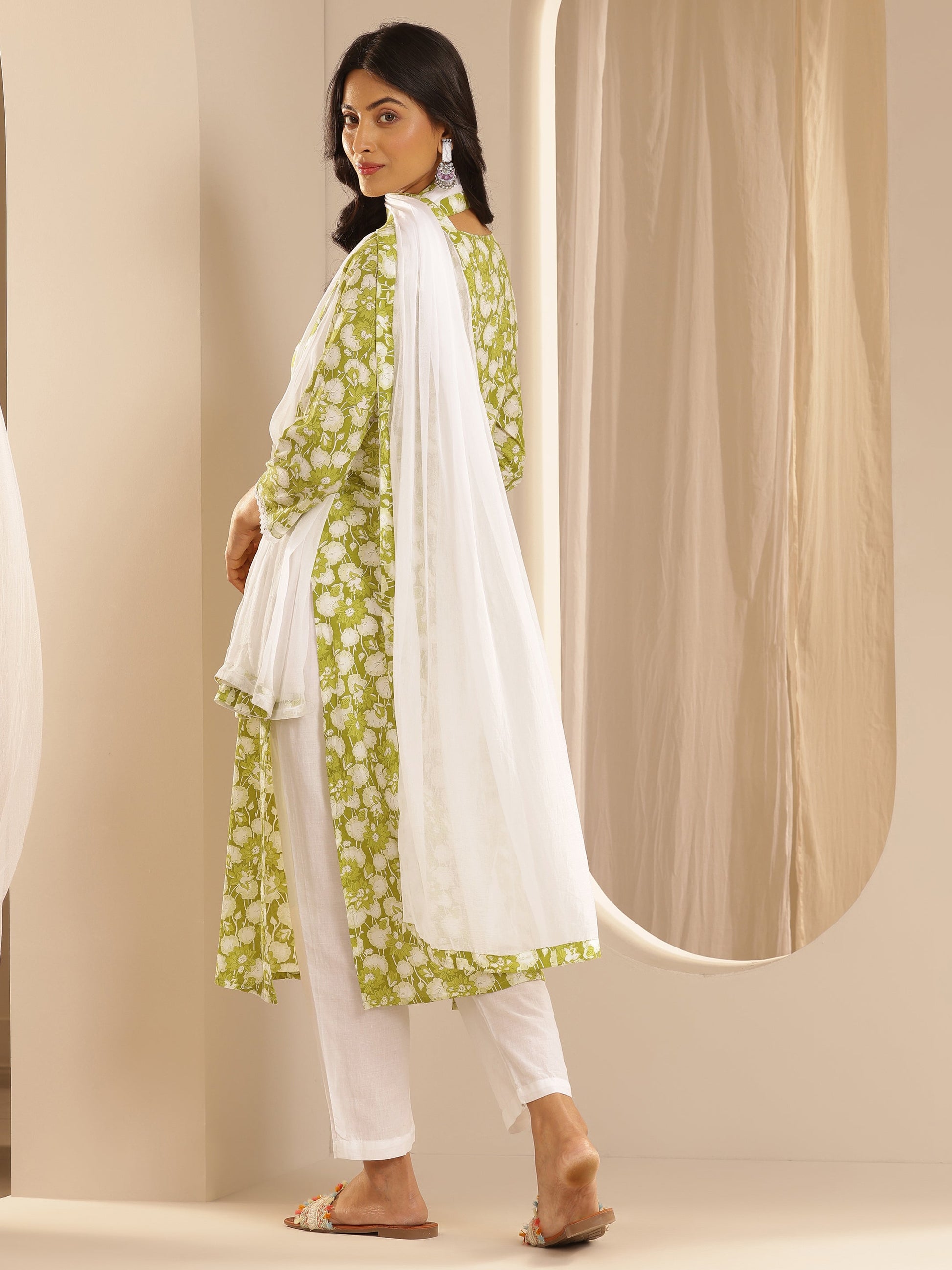 Green Printed Cotton Straight Suit Set With Dupatta