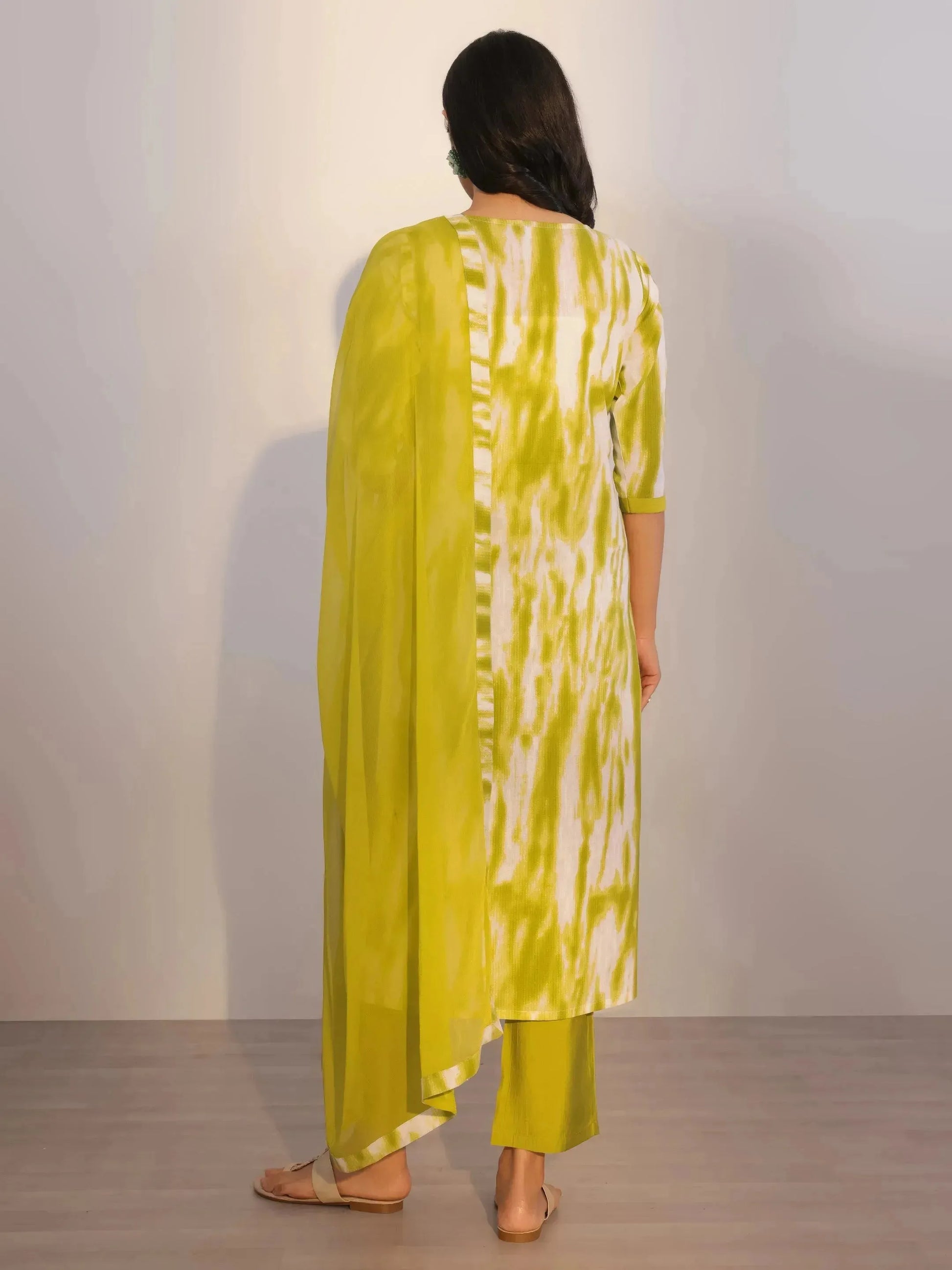 Our 3-piece green printed cotton straight suit set features a straight-fit kurta with a round neckline and three-quarter sleeves. Complemented with straight pants with a partially elasticated waistband and a printed poly chiffon dupatta. Adorned with a tie-dye print and fabric-trim accents, this style is ideal for elevated everyday wear.