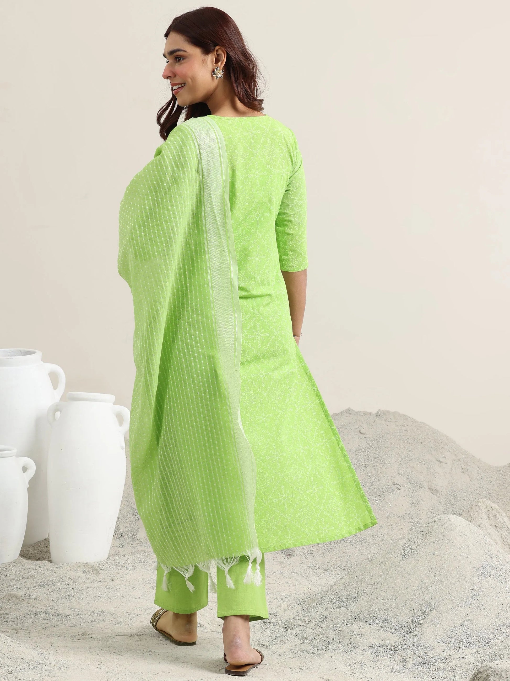 Our 3-piece green printed cotton blend straight suit set features a straight-fit kurta with a classic V-neckline and three-quarter sleeves. Complemented with solid trousers with a partially elasticated waistband, roomy pockets, and a dupatta. Adorned with floral prints, charming sequins, and stylish beads, this elegant style is perfect for work and beyond.