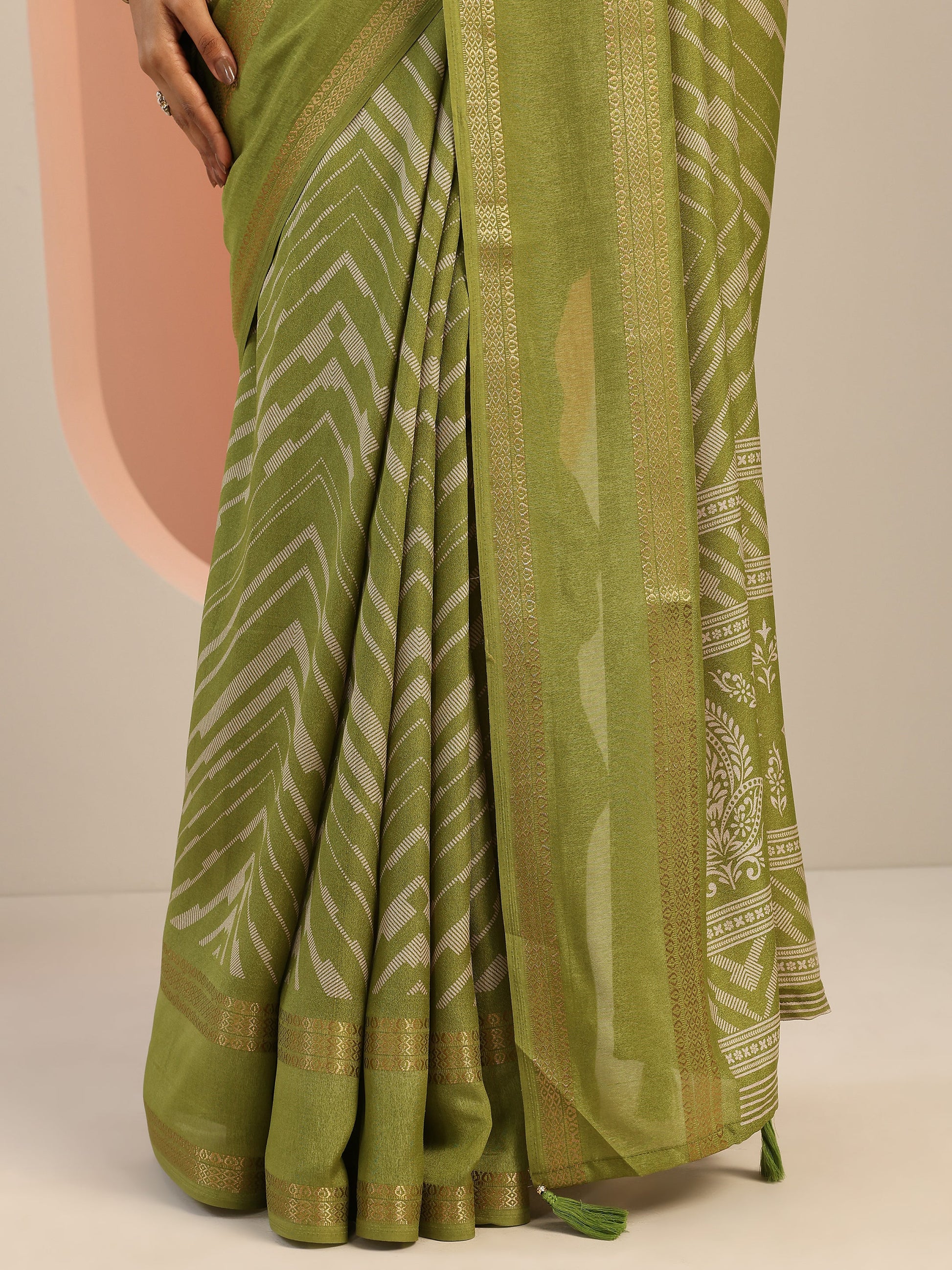 Our Olive Printed Georgette Saree Features Captivating Woven Design. Complemented With A Unstitched Blouse Piece. This Charming Saree Is Perfect For Festive Wear.