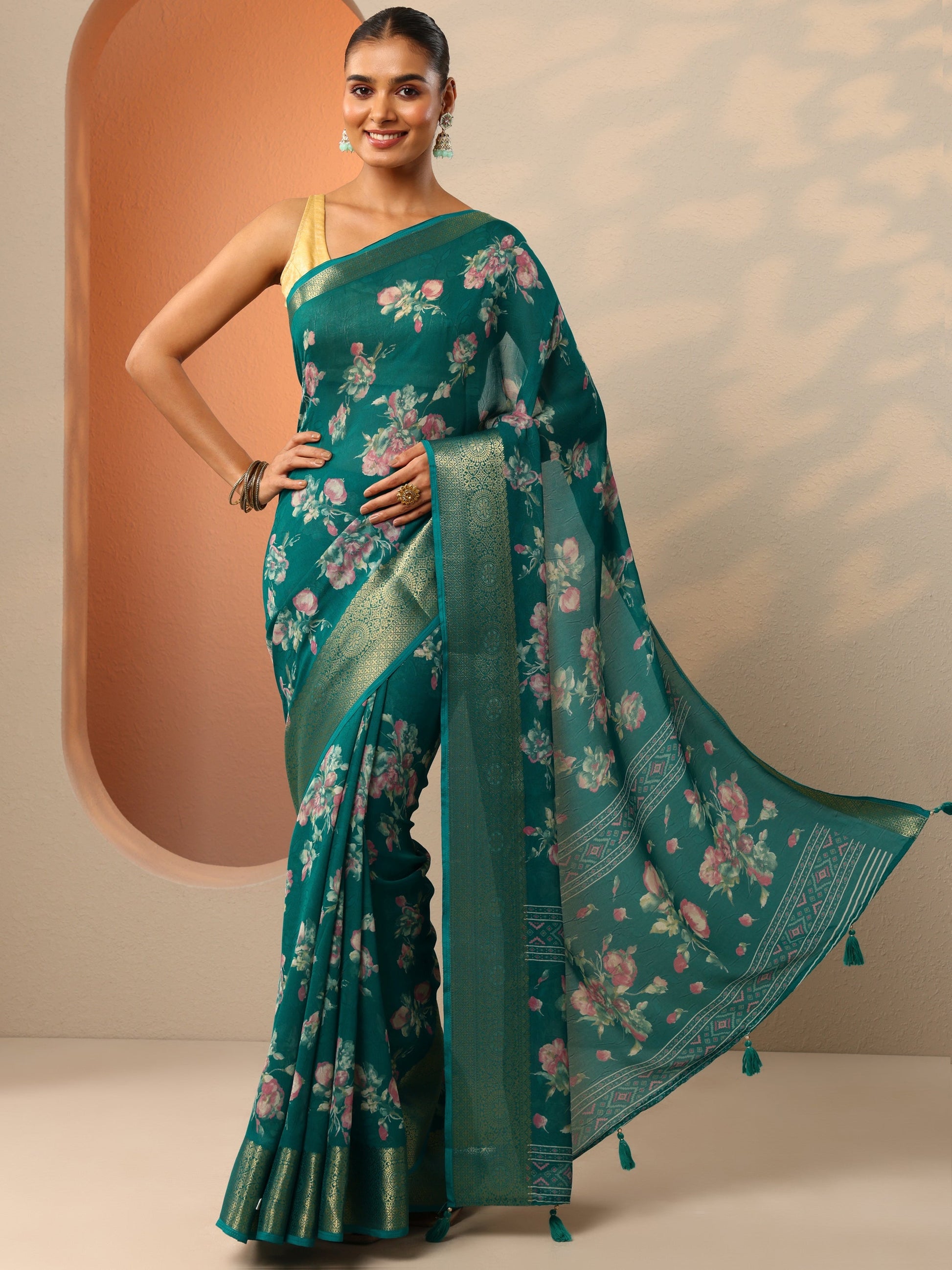 Our Teal Printed Georgette Saree Features Captivating Floral Print. Complemented With An Unstitched Blouse Piece. This Charming Saree Is Perfect For Festive Wear