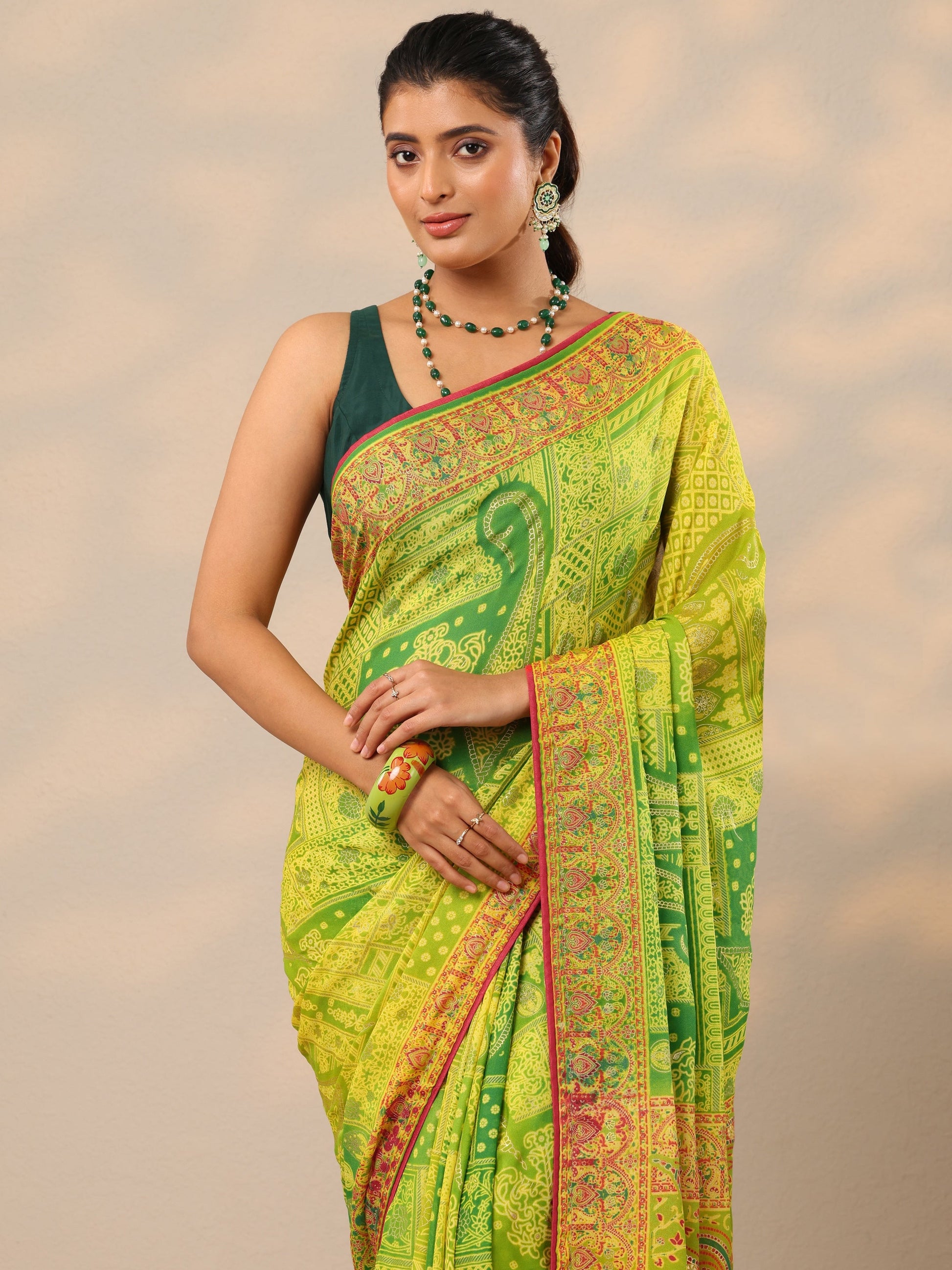 Green Printed Georgette Sarees With Unstitched Blouse Piece