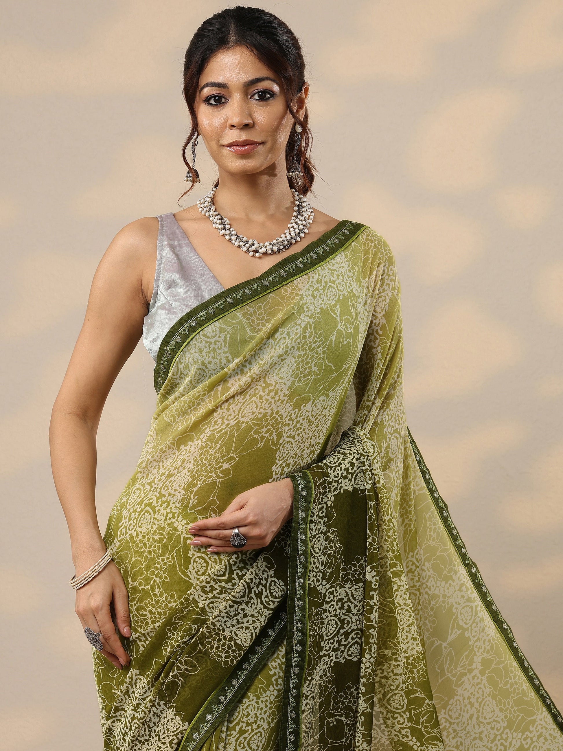 Green Printed Georgette Sarees With Unstitched Blouse Piece